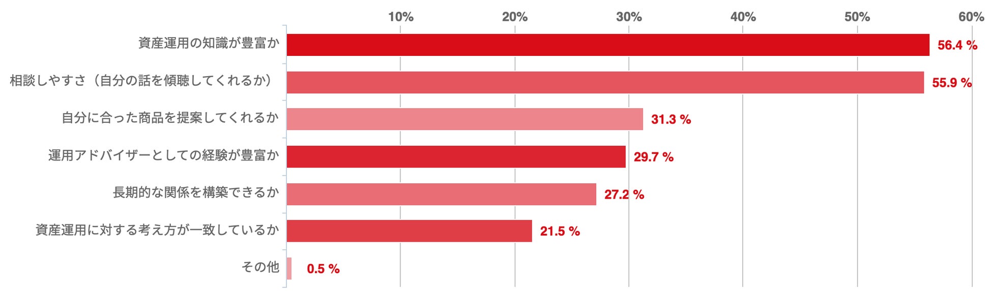 また、「自分に合った商品を提案してくれるか(31.3%)」や「運用アドバイザーとしての経験が豊富か(29.7%)」、「長期的な関係を構築できるか(27.2%)」も重要な要素となっている。