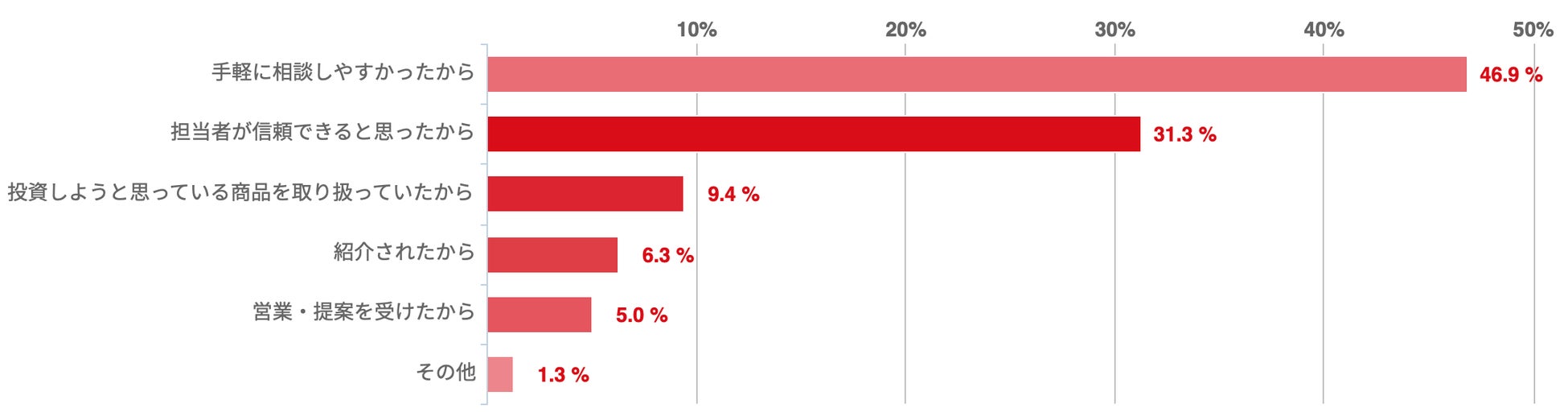 アンケートによれば、資産運用の相談先を選んだ理由として「手軽に相談しやすかったから(46.9%)」と「担当者が信頼できると思ったから(31.3%)」が主に挙げられた。
