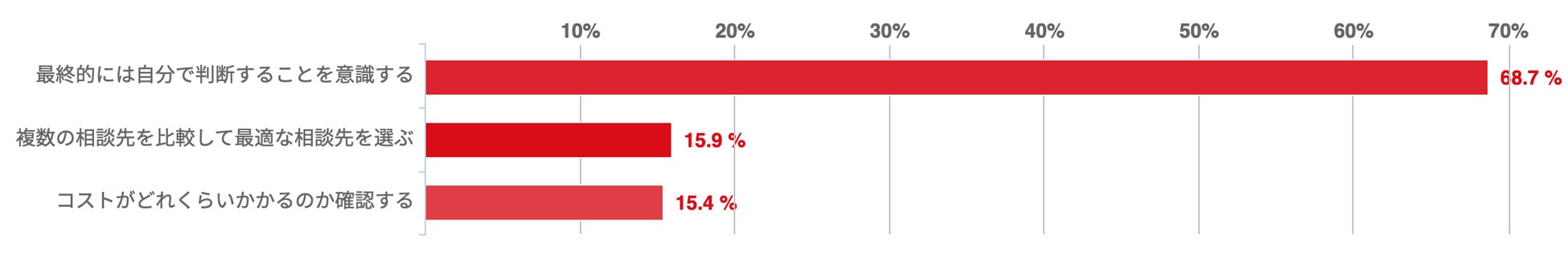 資産運用の相談をする際の注意点としては「最終的には自分で判断すること(68.7%)」が圧倒的多数の回答者から選ばれた。相談内容を鵜呑みにするのではなく、受けたアドバイスを元に自分で考えて投資判断を行うことが大切となる。