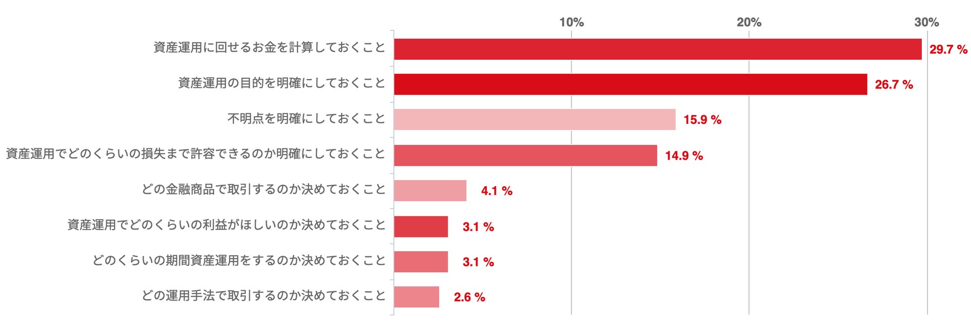 アンケートによれば、資産運用の相談前に準備すべきこととしては「資産運用に回せるお金を計算しておくこと(29.7%)」や「資産運用の目的を明確にすること(26.7%)」を挙げた回答者が多かった。