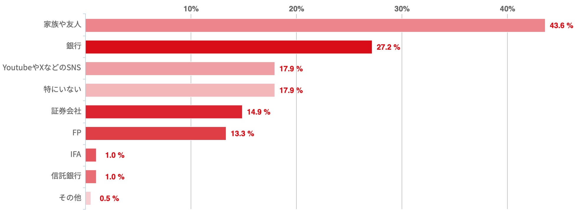 資産運用の相談先として最も人気だったのは「家族や友人(43.6%)」であり、次いで「銀行(27.2%)」や「SNS(17.9%)」が選ばれていた。また、「資産運用の相談先がいない」回答者も17.9%おり、どこに相談すべきか迷っている様子も見られた。
