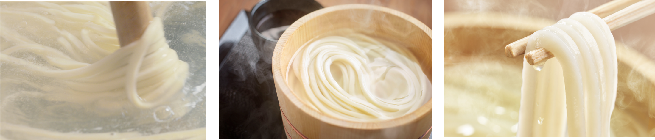 それぞれの具材から染みだす旨みが、すっきりとしながらもやや甘みのある特製だしに溶け出し、もちもちのうどんと絡みます。一体感のある味わいをご堪能ください。