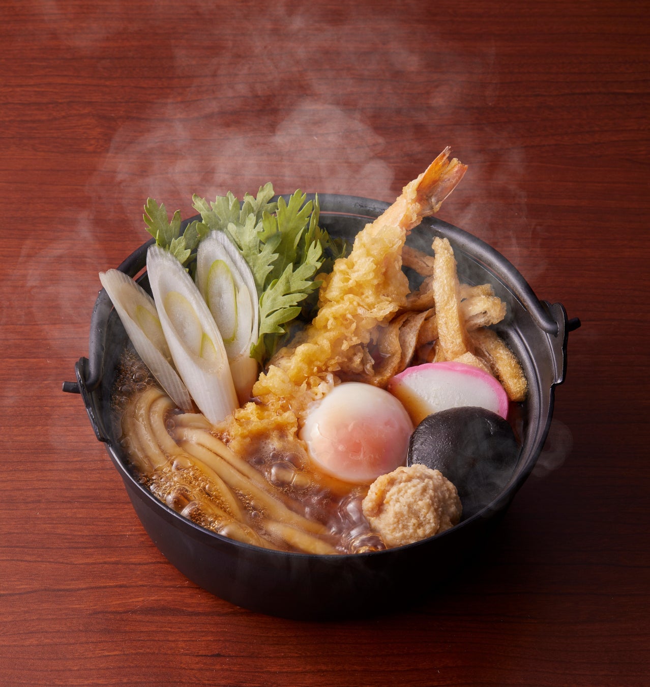 店内でひとつずつ丁寧に揚げる人気のえび天をはじめ、肉団子、しいたけ、油揚げ、温泉玉子、春菊、白ねぎ、かまぼこの彩り豊かな8種の具材がたっぷり詰まったご馳走感のある一品です。