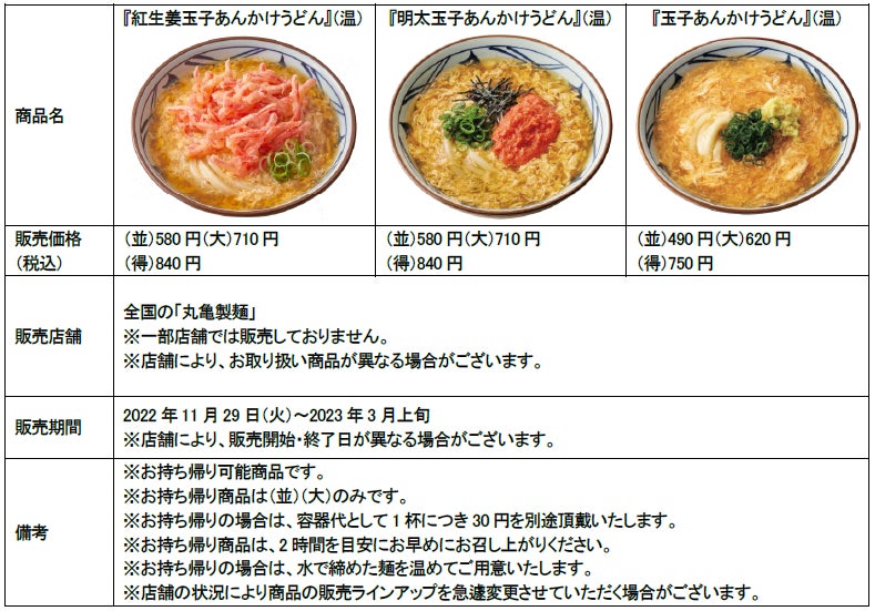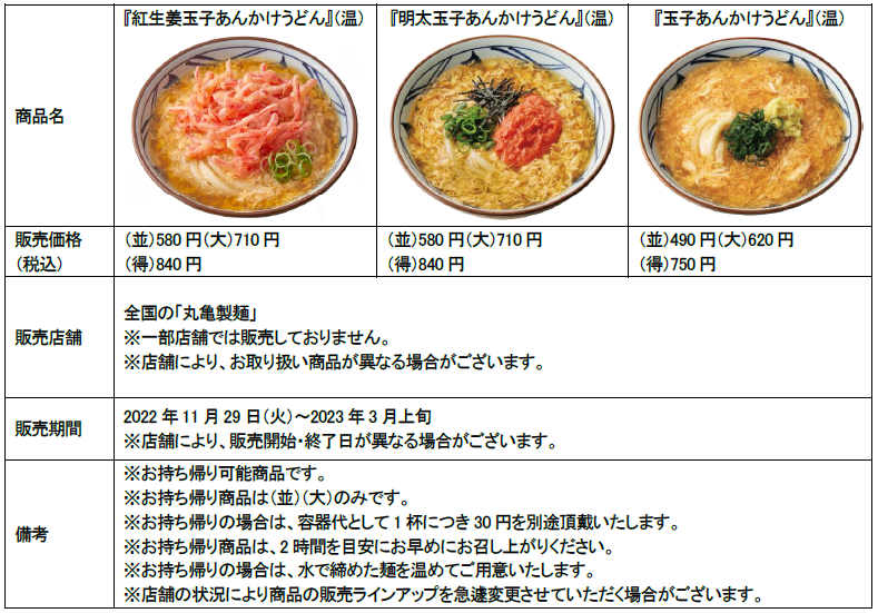 茹でたてもちもちのうどんにとろふわ食感の特製玉子あんかけがよく絡む「玉子あんかけうどんラインアップ」が今年も登場する季節となりました。定番の『玉子あんかけうどん』『明太玉子あんかけうどん』に加えて、今年は、新作『紅生姜玉子あんかけうどん』も登場!