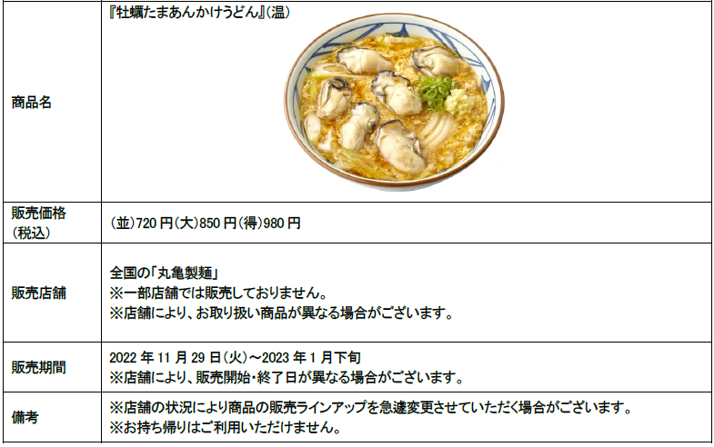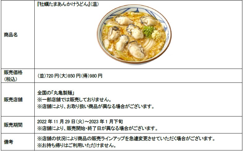 冬にしか出会えない 丸亀製麺の手づくり・熱々のうどんが勢揃い 広島県産浜ゆで牡蠣を6個贅沢に!熱々、濃厚な旨み広がる『牡蠣たまあんかけうどん』が今年も登場!