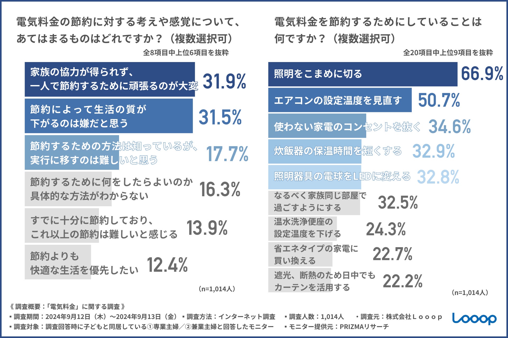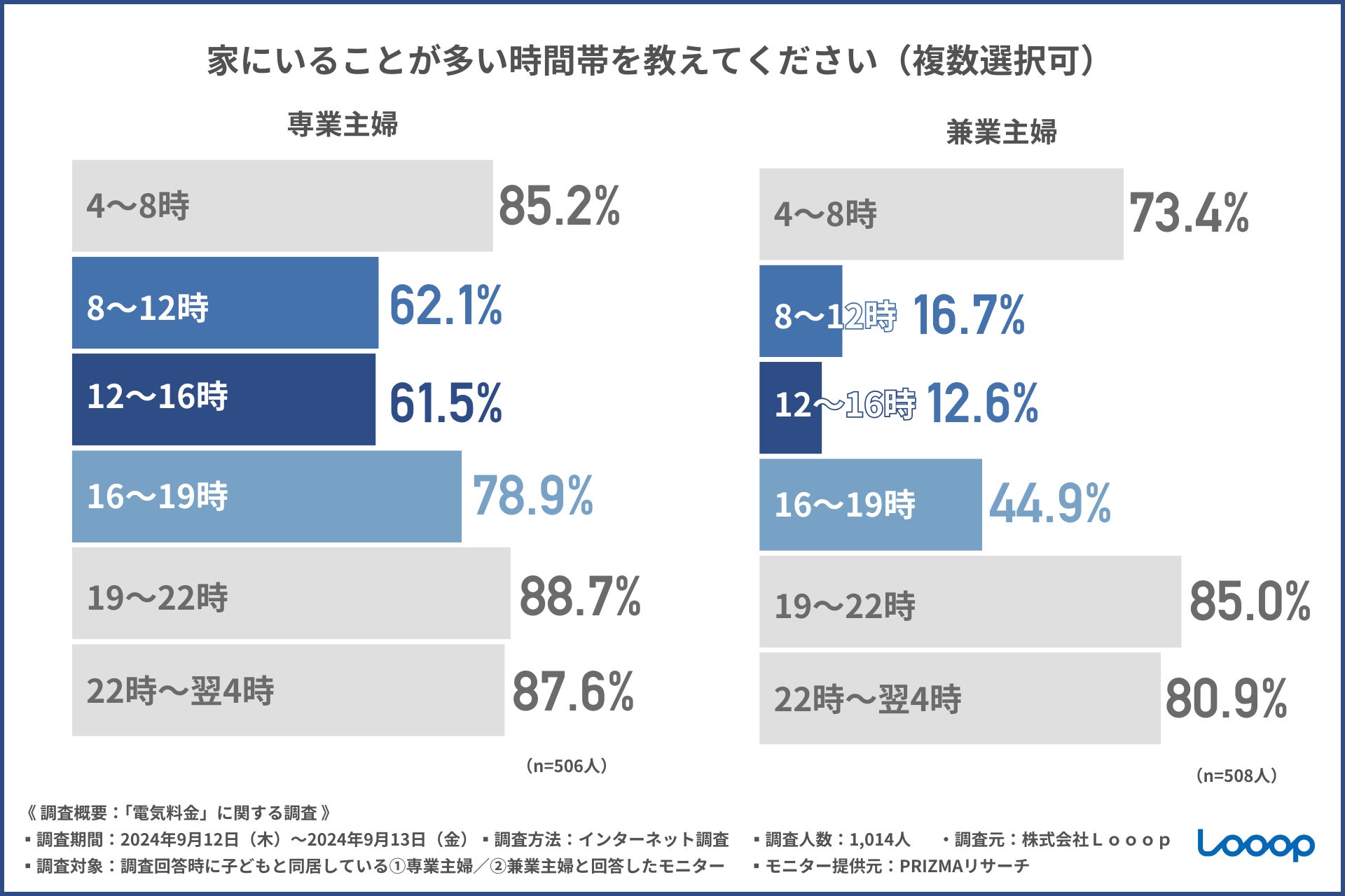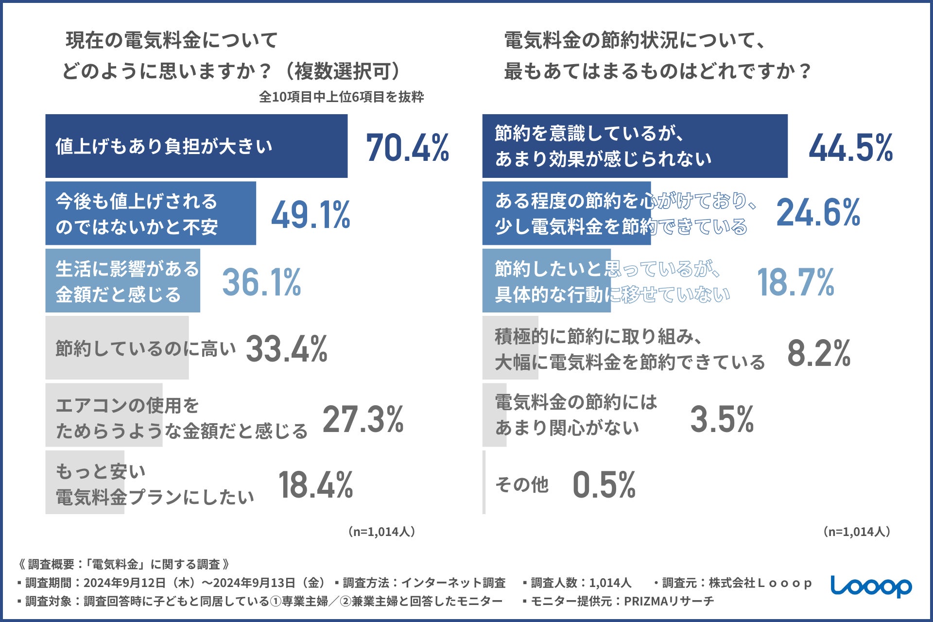 「エネルギーフリー社会の実現」をビジョンに掲げ、再生可能エネルギーのニーズ喚起と普及を目指す株式会社Looop(本社所在地:東京都台東区、代表取締役社長:森田 卓巳)は、政府による電気代の補助(参考URL:https://www.meti.go.jp/press/2024/07/20240729001/20240729001.html)があった9月の段階で、子どもと同居している専業主婦/兼業主婦を対象に、電気料金に関する調査を行いました。