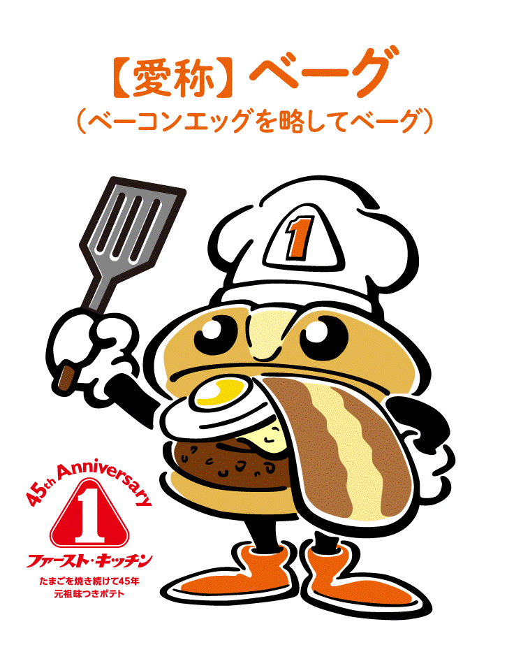 ウェンディーズ·ジャパン株式会社及び、ファーストキッチン株式会社 (所在地:東京都新宿区、代表取締役:紫関修) は、ファーストキッチンが昨年9月に創立45周年を迎えたことを記念して、お客様よりマスコットキャラクターの公募を実施しました。応募総数はなんと420点!たくさんのご応募をいただき誠にありがとうございました。当社の特徴やイメージを踏まえて選考した結果、創業当初よりお客様から愛され続けている看板商品「ベーコンエッグバーガー」をモチーフとしたキャラクター『ベーグ』が大賞作品として決定しました!大賞に選ばれた作品は今後、公式マスコットキャラクターとして、様々なプロモーションやPR活動で活躍していく予定です。今後の活動にご期待ください。