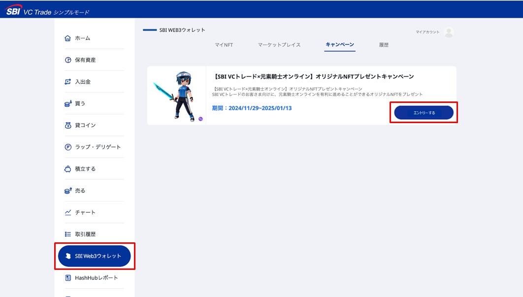 Web版の取引ツール「シンプルモード」にログインの上、メニュー「SBI Web3ウォレット」から「キャンペーン」をご選択いただき、「エントリーする」ボタンにてエントリーしてください。