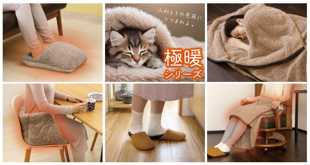 『極暖』シリーズの新商品展開。ちいさなこたつ、チェアクッション、包み込まれるチェアカバー、寝袋にもなる毛布、バブーシュ。