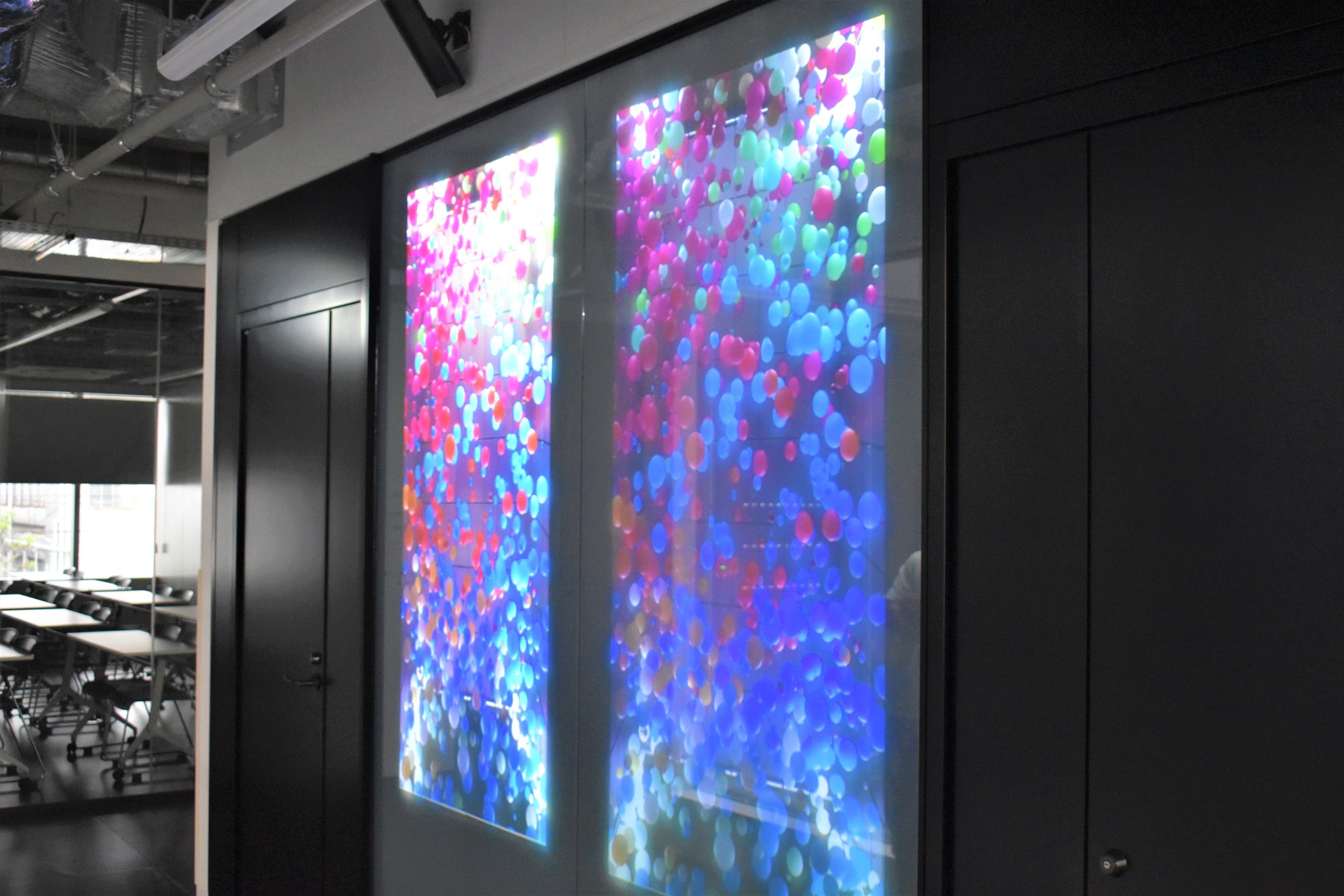 従来、無機質な印象を持つサーバルームを、視覚的にも楽しむことができる”インタラクティブサーバルーム”として構築。サーバルーム壁面に、電子ブラインド及びプロジェクタ、スピーカーやセンサを設置して、様々なインタラクションを可能にしました。今後学生たちが、サーバルームをひとつのキャンバスとして自由に活用し、キャンパスの雰囲気づくりに貢献していきます。