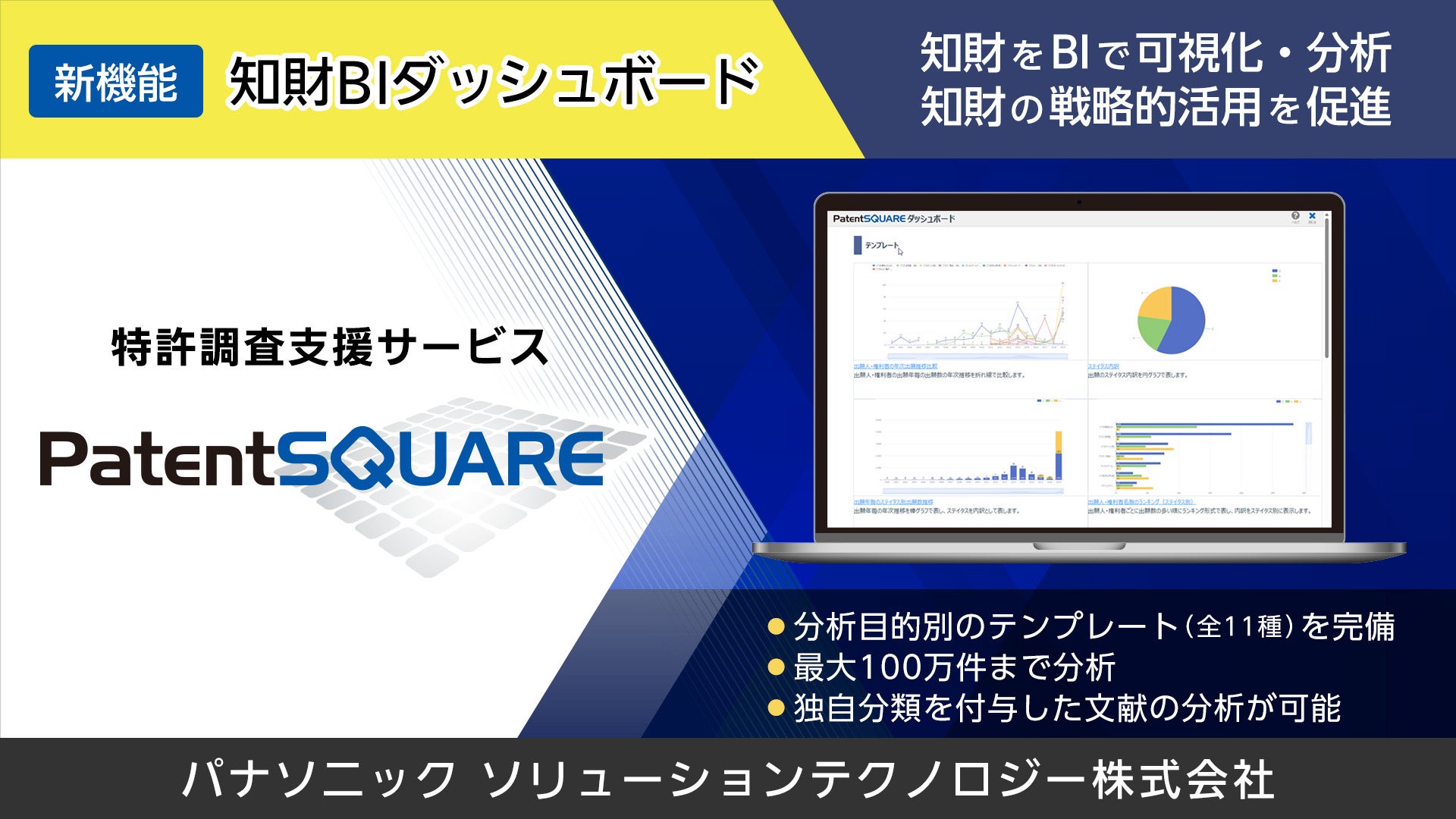 パナソニック ソリューションテクノロジー株式会社(本社:東京都、代表取締役社長:伊藤 一義/以下、パナソニック)は、30年以上にわたり開発・機能改善を続けてきた特許調査支援サービス「PatentSQUARE」の機能を拡充し、知財情報を事業や経営戦略に生かすため、知財情報の可視化・分析をBIで支援する「知財BIダッシュボード」を開発し、2024年9月より提供を開始しました。また、この度の新機能リリースに伴い、PatentSQUAREの初年度における月額利用料を特別価格で提供するキャンペーンも開始しています。