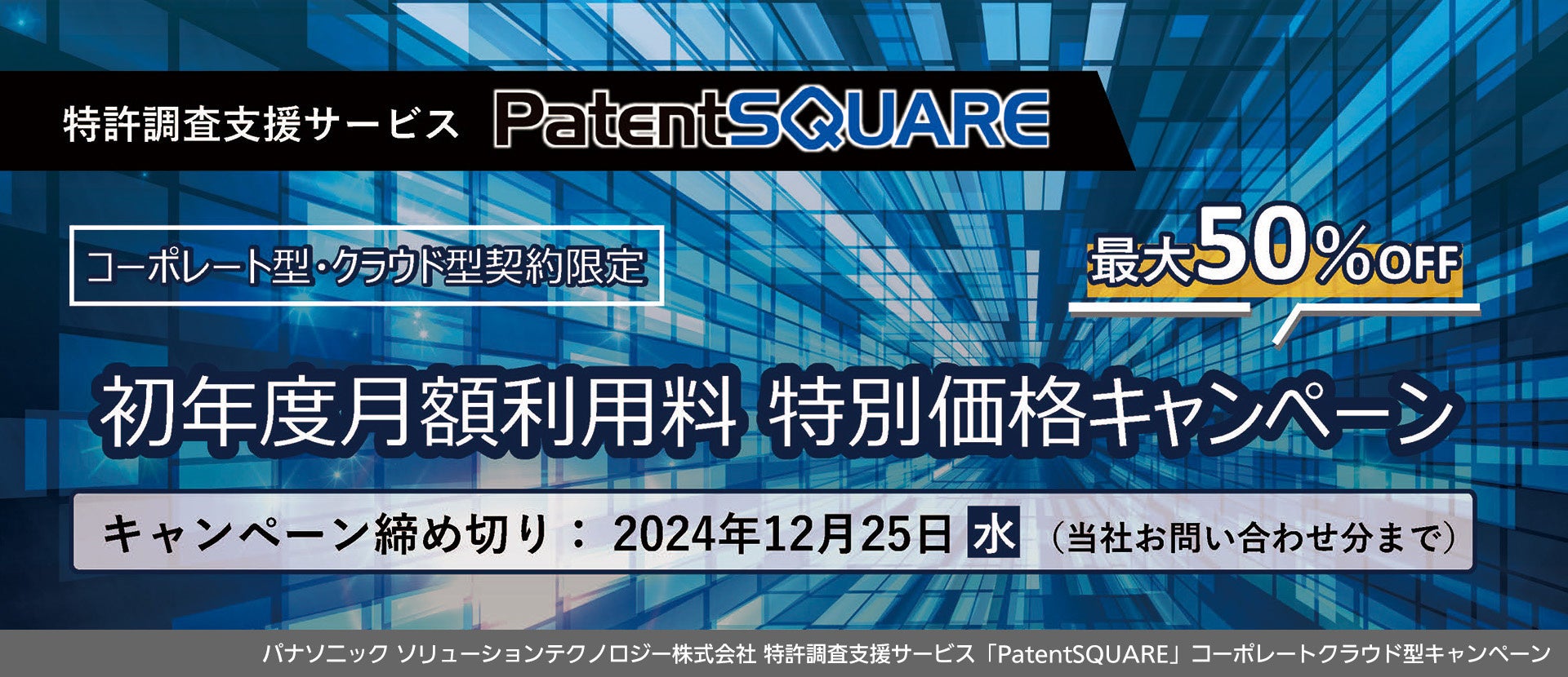 PatentSQUAREのコーポレート型・クラウド型をご契約いただく方を対象に、初年度の月額利用料を特別価格でご提供する期間限定のキャンペーンを開始しました。詳細は以下のWebサイトをご覧ください。