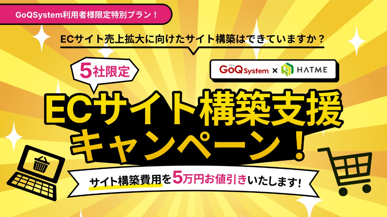 受注一元管理システム「GoQSystem」利用社(者)様(※)がHATME株式会社様にECサイト構築を依頼した場合、そのECサイト構築費用が5万円お値引きされます。