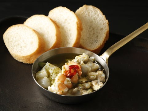 イカ・エビ・アサリの具だくさんアヒージョ。卓上の鉄板で出来立て熱々をどうぞ! 海鮮の旨味が凝縮された贅沢な味わいのオイルソースをバゲットに浸して最後まで楽しめます。