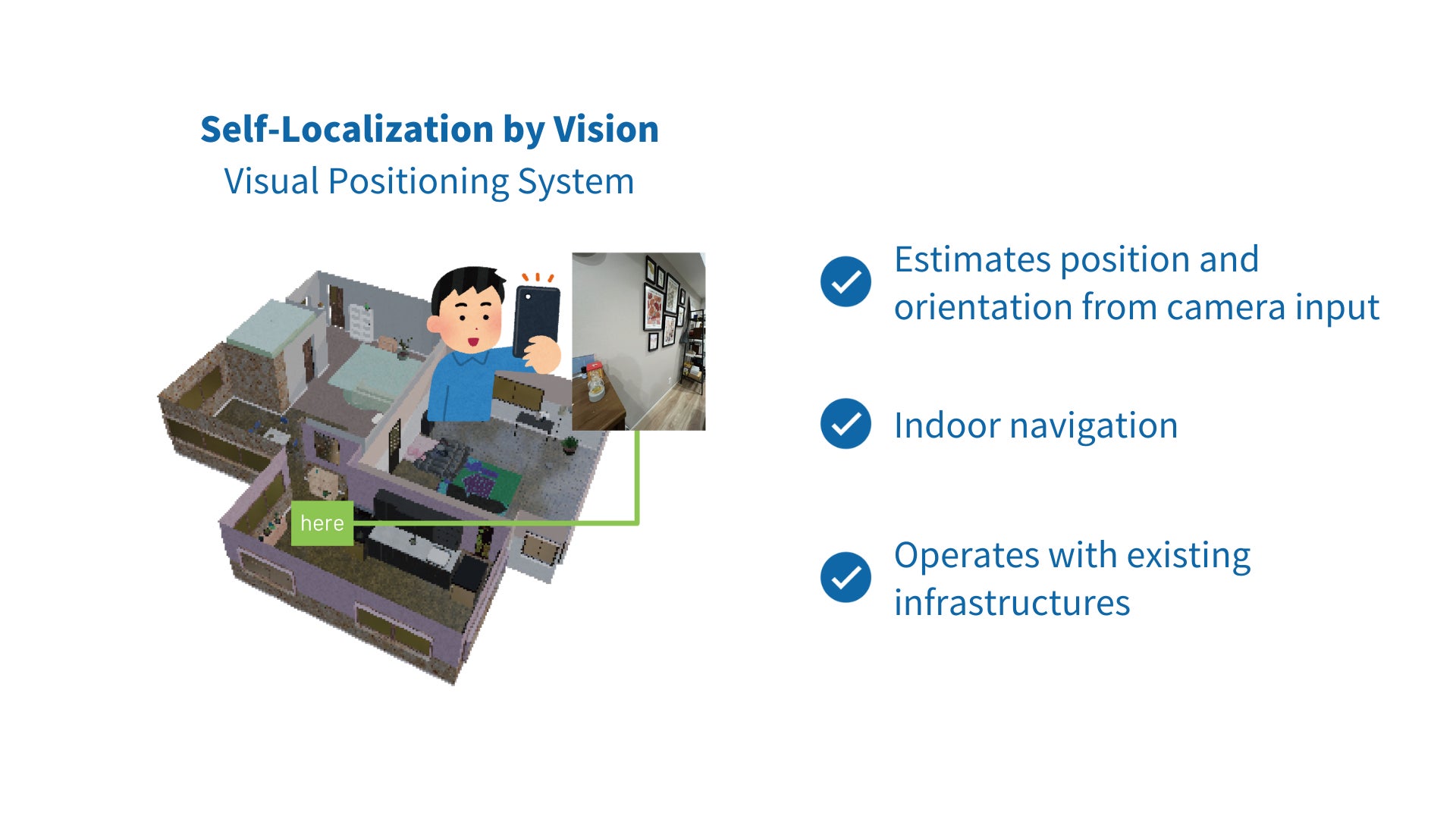 屋内のショッピングモールやビルの谷間などにおいて、画像を用いたピンポイントな位置・姿勢推定を実現。