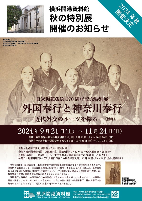 令和6(2024)年は、安政元(1854)年に横浜で日米和親条約が結ばれてから170周年にあたります。同条約の締結によって、日本は欧米諸国と恒常的に「外交」をおこなう必要に迫られ、幕府は安政5年(1858)外国奉行(外国方)を創設します。一方、開港された横浜には神奈川奉行が置かれ、外国貿易の管理と横浜周辺の行政を担当することになりました。