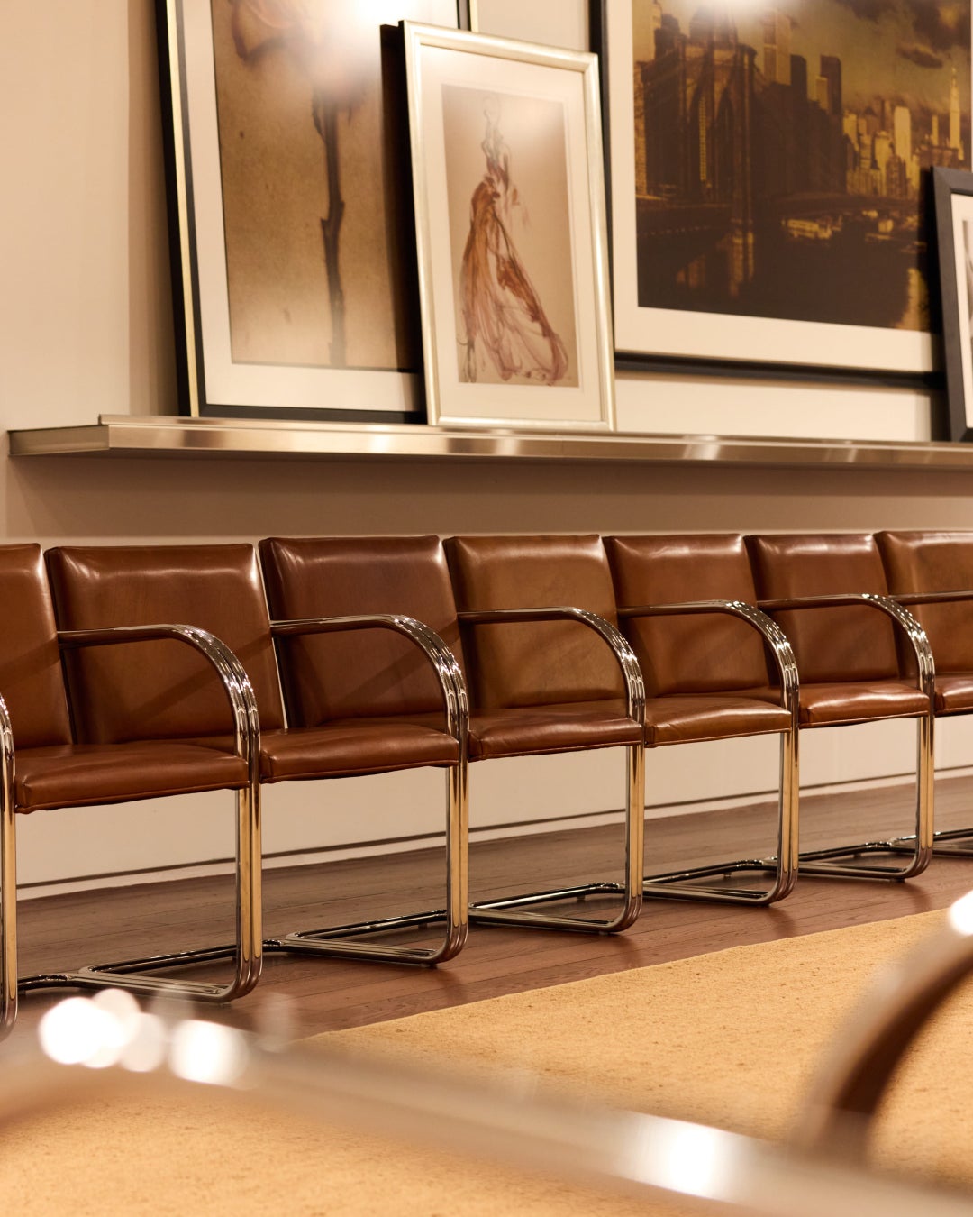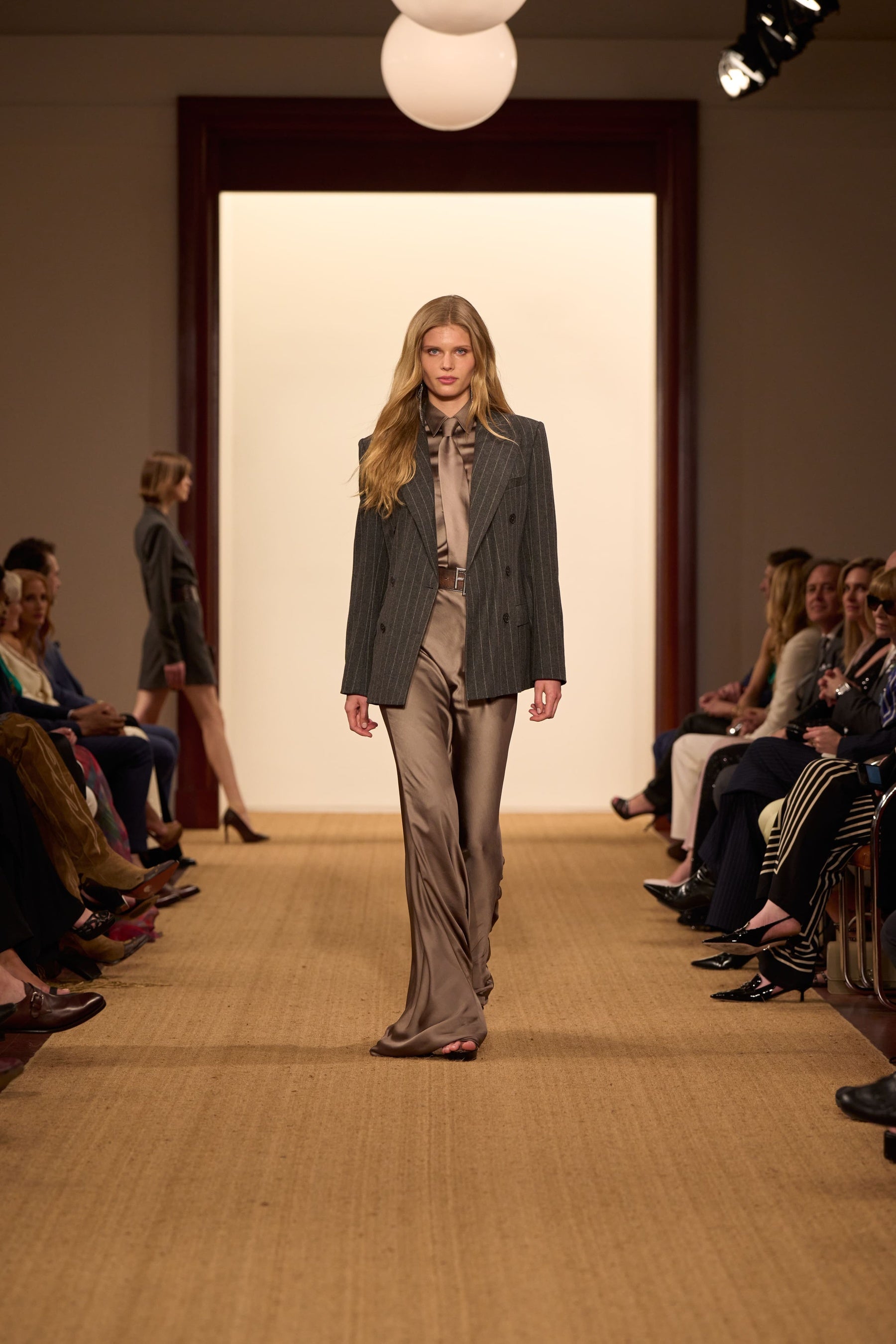 光沢のあるクロームのアクセント、モダンなカンチレバーチェア、そしてマホガニーのディテールにフィーチャーされた、マンハッタンのギャラリーのような洗練されたランウェイの空間は、すぐ近くにあるラルフ・ローレン自身のオフィスと同じ美学を彷彿とさせます。