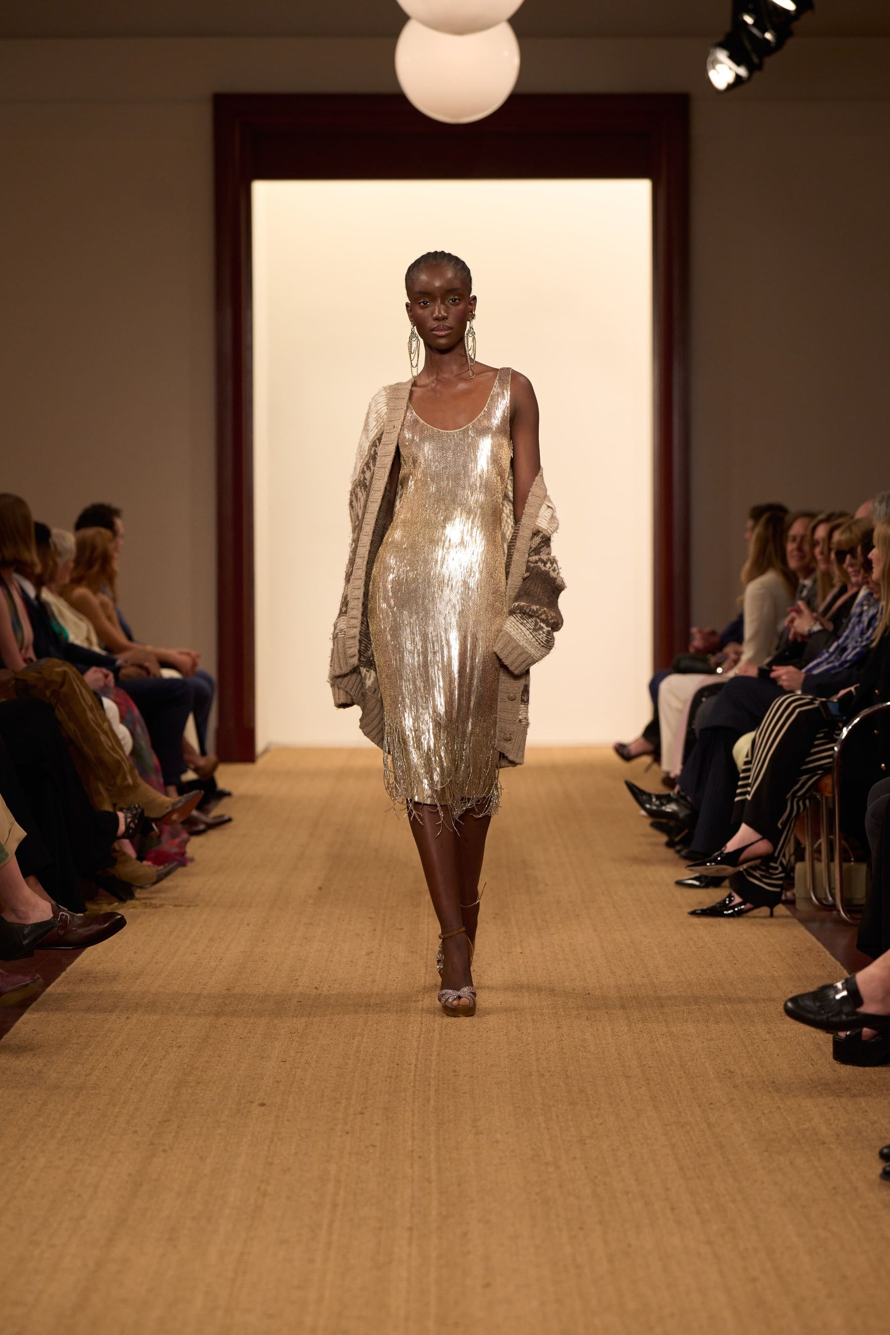 ニュートラルとメタリックの柔らかなカラーパレットで表現されたコレクションは、自然体で自信に満ち、タイムレスな女性のラグジュアリーかつ繊細なスタイルを思い起こさせます。テーラードのトリミング スーツジャケット、ドレープニット、スエードとレザーのセパレーツ、バイアスカットのガウンは、ラルフ・ローレンの最も個人的なインスピレーションを表現しています。ミニマリズムと芸術性のバランスを注意深く保ちながら、ビーズとツイード、パッチワークと装飾を組み合わせることで、お気に入りのアイテムに装飾的なタッチを加えています。