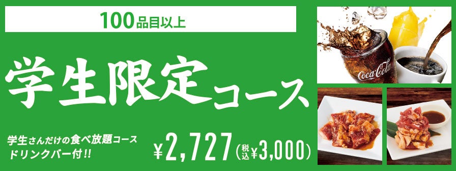 ・食べ放題コースの料金にドリンクバーは含まれておりません。別途390円(税込429円)でご利用いただけます。学生限定コースのみ、ドリンクバーが含まれております。