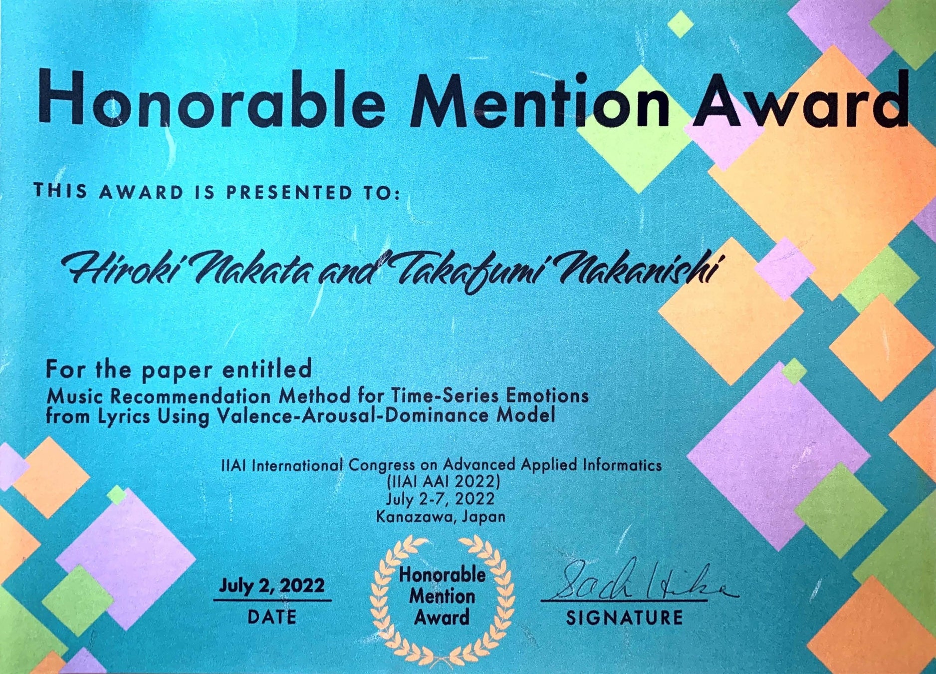 【武蔵野大学】データサイエンス研究科修士課程2年生が国際学会IIAI AAI 2022で上位の論文に授与されるHonorable Mention Awardを受賞!