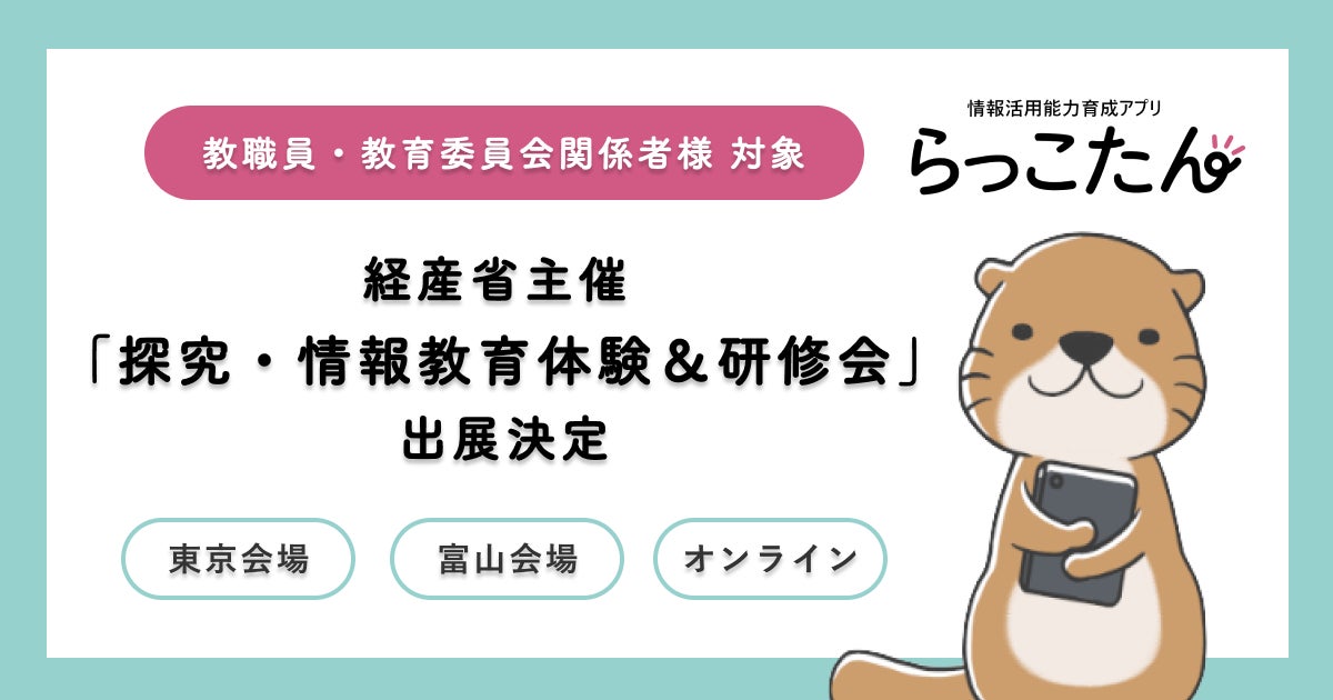 自治体向けサービスを開発する株式会社ミラボ(本社:東京都千代田区、代表取締役:谷川一也、以下「ミラボ」)と、情報モラル教育・プログラミング教育を手がける株式会社教育ネット(本社:神奈川県横浜市、代表取締役:大笹いづみ、以下「教育ネット」)が共同開発したクラウド型デジタルAI教材「らっこたん」が、経済産業省主催『探究・情報教育体験&研修会』への出展が決定しました。