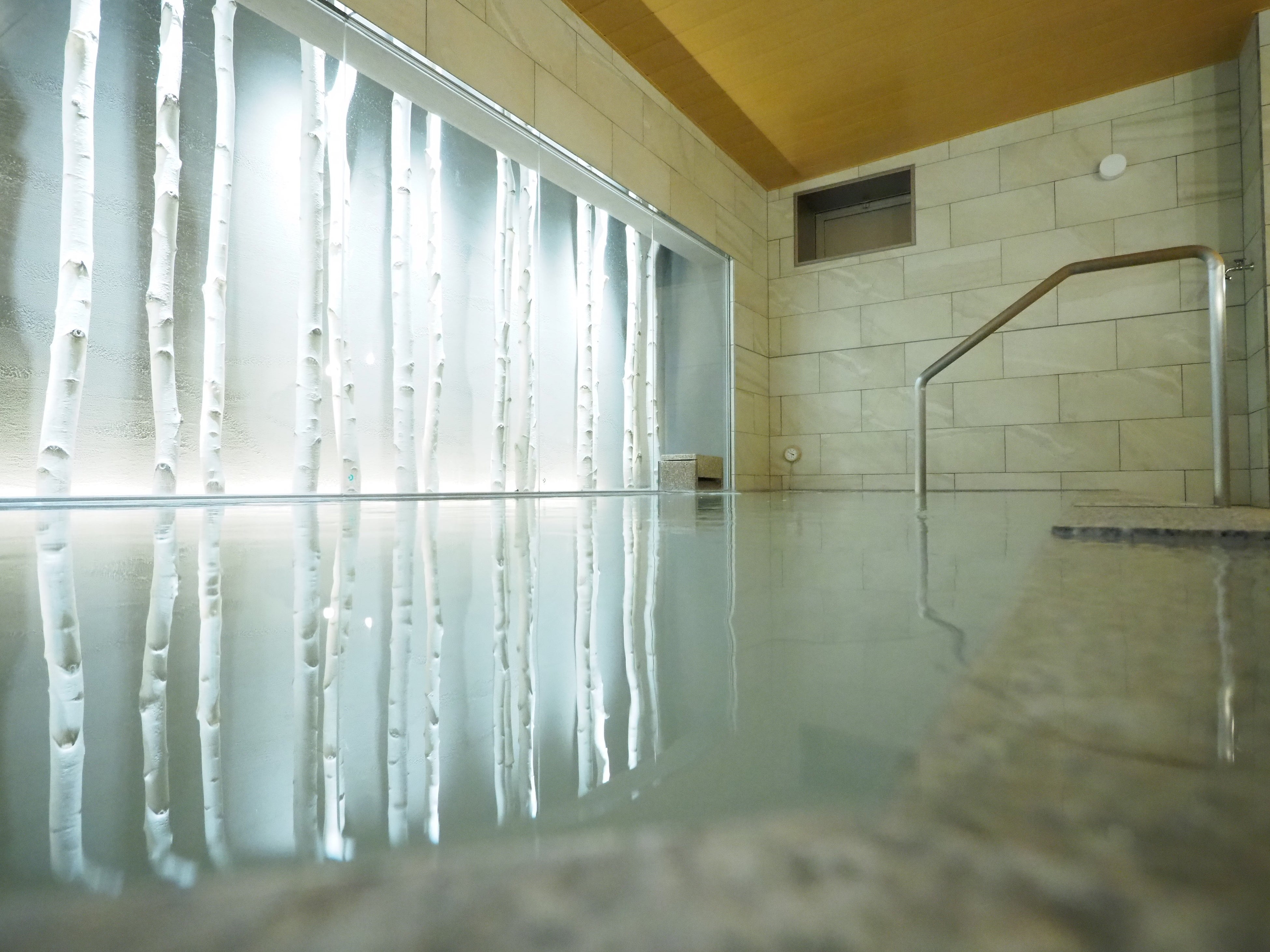 大浴場 白濁人工温泉「白樺の湯」 屋内大浴場ながらも露天風呂のような開放感と、白樺の美しさを堪能できる癒しの空間です。