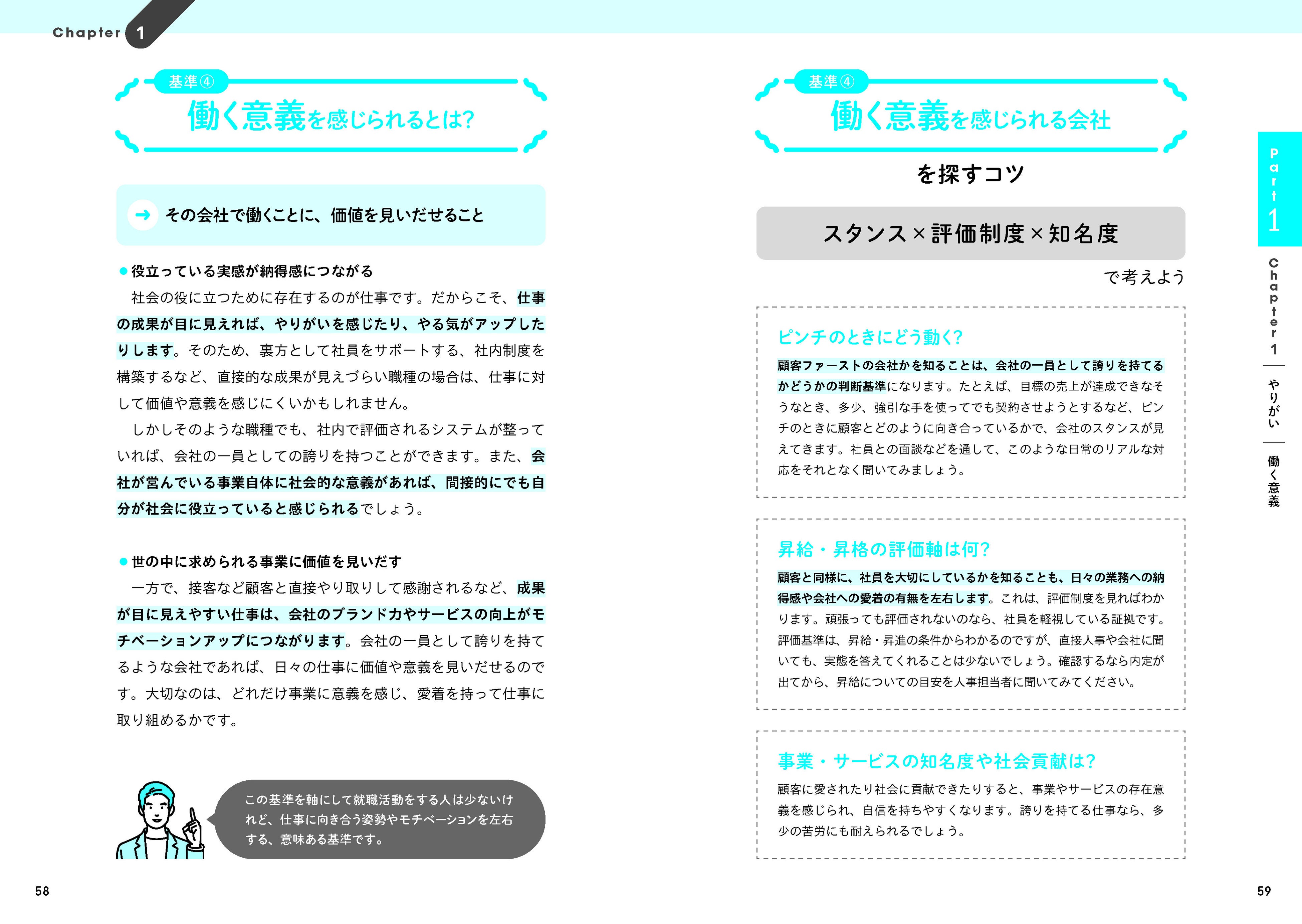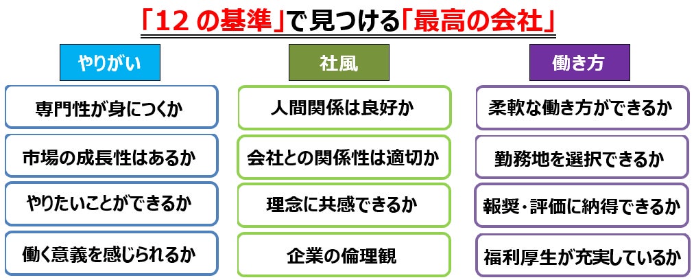 空前の人手不足で、就活・転職活動は超売り手市場を迎えています。求職者は、条件に合った企業を選べる有利な状態です。しかし、3年以内の離職率は高いまま。そこで、年間45万人の会員を持つ就活対策サイト「キャリアパーク!」が、ミスマッチを防ぎ、ブラック企業をかぎ分け、最高の会社を見極める方法を紹介。「やりがい」「社風」「働き方」の3つの観点から会社選びに大切な12の基準を提示します。