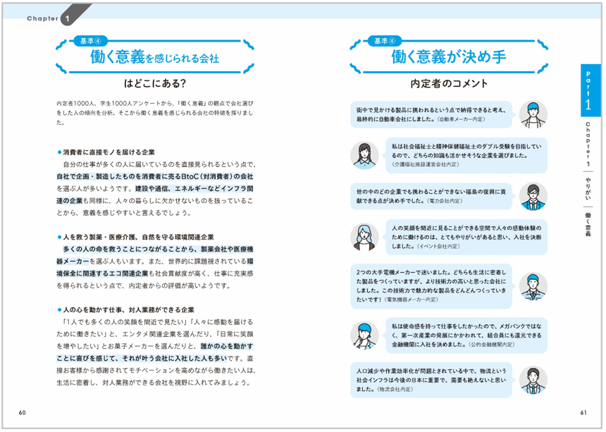 本書では「最高の会社」を・適性がある・やりたいことができる・理想の自分を実現できる・内容や仕事量に見合った報酬が得られる会社と定義しています。年間3000人以上の学生を内定に導いてきたキャリアアドバイザーが、会社を選ぶ際で重要となる「12の基準」を提示。各項目には業界や企業を見極めるためのヒントを提示しました。