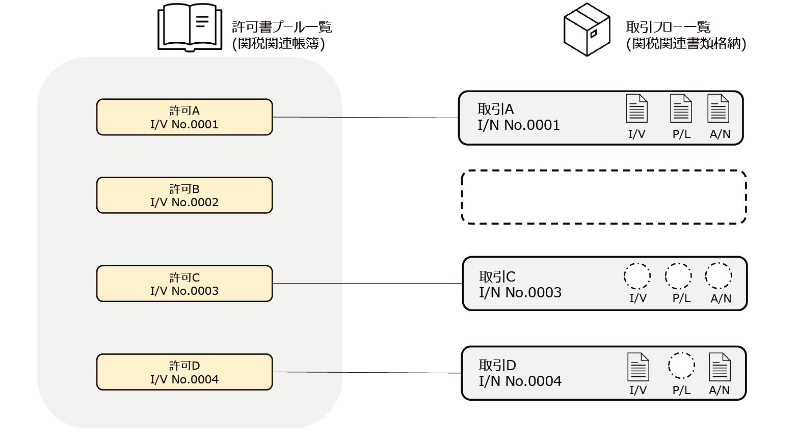 TradeWaltzの「関税関係帳簿の保管」および「取引情報紐づけ」機能は、許可書情報を構造化データで一元管理することで電子的な関税関係帳簿とすることができ、さらに各許可情報が対象の取引情報と紐づけられることにより、取引後に税関が行う事後調査にも活用できる機能です。具体的には、TradeWaltz内での電子書類保管時にタグ付けしたインボイス番号などの共通キーワードをもとに、輸入許可データと書類の関連付けを自動で行います。