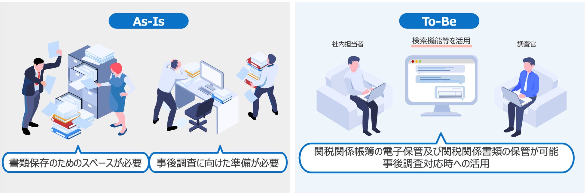 税関による税務調査である輸入事後調査では、定期的に税関職員が輸入者の事業所を訪問し、上記の帳簿や書類の確認を行います。企業は、指定された輸入期間の書類一式を揃える必要があり、税関は、輸入件数によっては膨大な量になる紙書類を調査するため、企業・税関双方に負担がかかっています。
