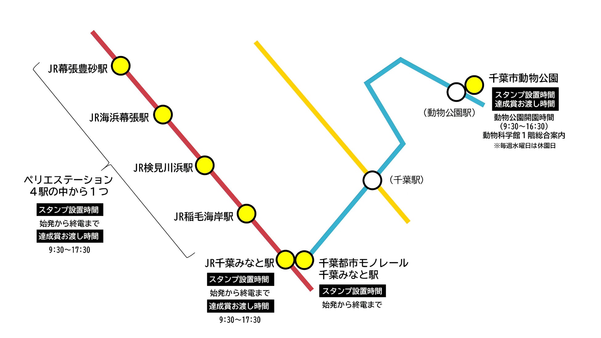 ペリエステーション4駅(幕張豊砂駅、海浜幕張駅、検見川浜駅、稲毛海岸駅)の中より1駅と、JR千葉みなと駅、千葉都市モノレール千葉みなと駅、千葉市動物公園のスタンプ合計4個を集めた方を対象に、先着150名さまに達成賞をプレゼントします!