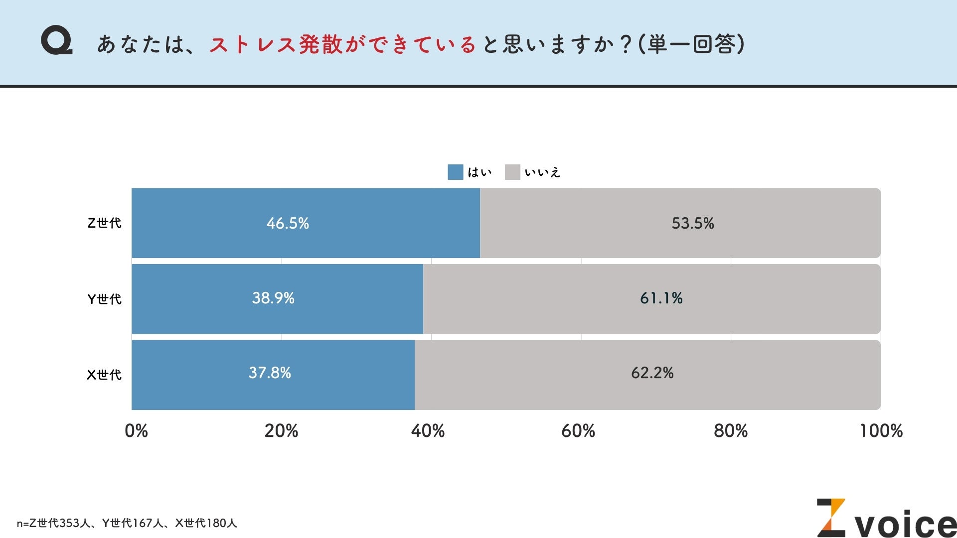 次に、そうしたストレスを発散できているかを聞いてみたところ、Y世代・X世代が「ストレス発散ができている」と答えたのは40%弱に留まった一方で、Z世代に関しては半数に近い46%が発散できていると回答しました。