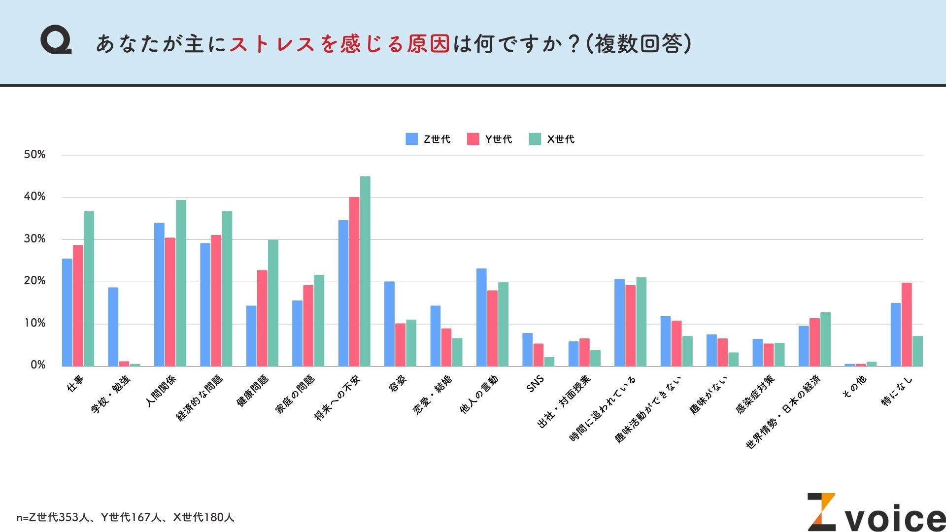 その結果、全世代でもっとも多かったのは「将来への不安」で、Z世代で34.6%、Y世代で40.1%、X世代で45.0%と、年齢を重ねるごとにストレスが増す様子がうかがえます。また、世代ごとで多少順位の前後はあるものの「人間関係」「経済的な問題」が2番目・3番目に多い回答となりました。