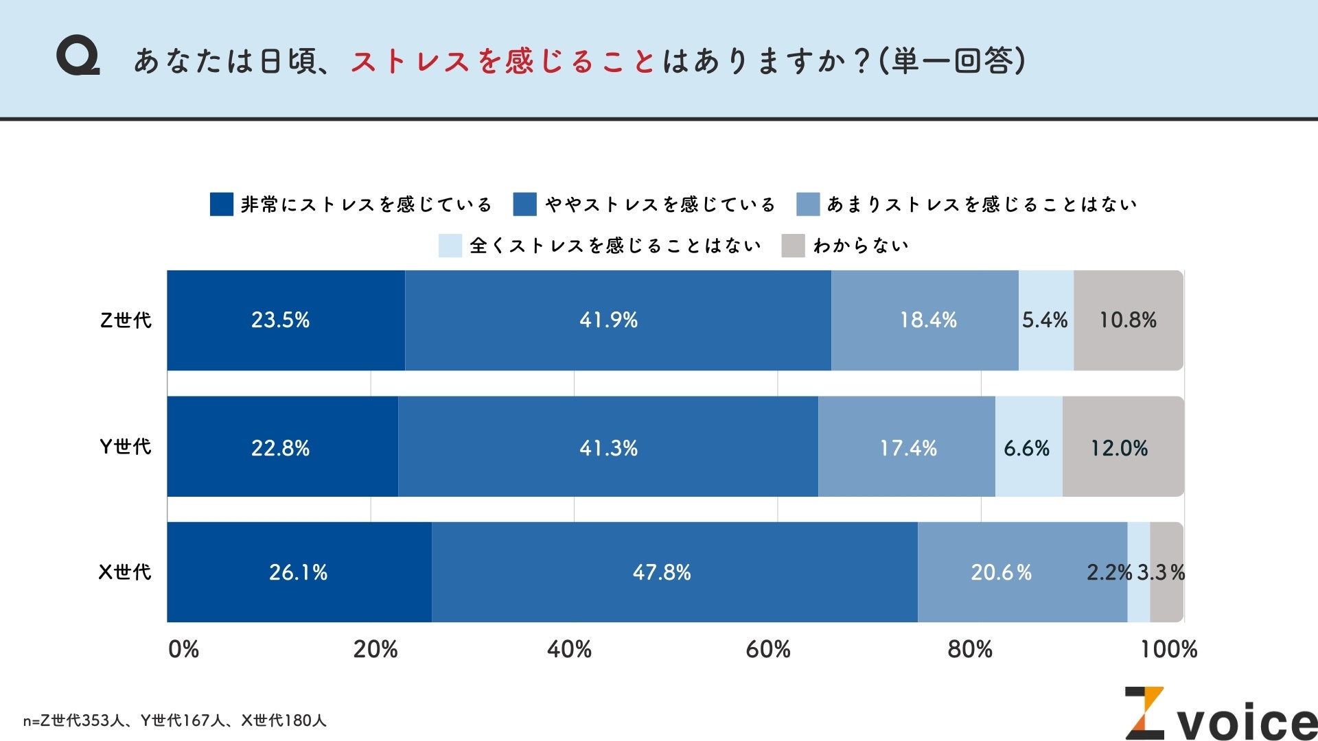 X世代のストレスが突出しているものの、いずれの世代も6割以上が何かしらのストレスを抱えて生活していることが明らかになりました。