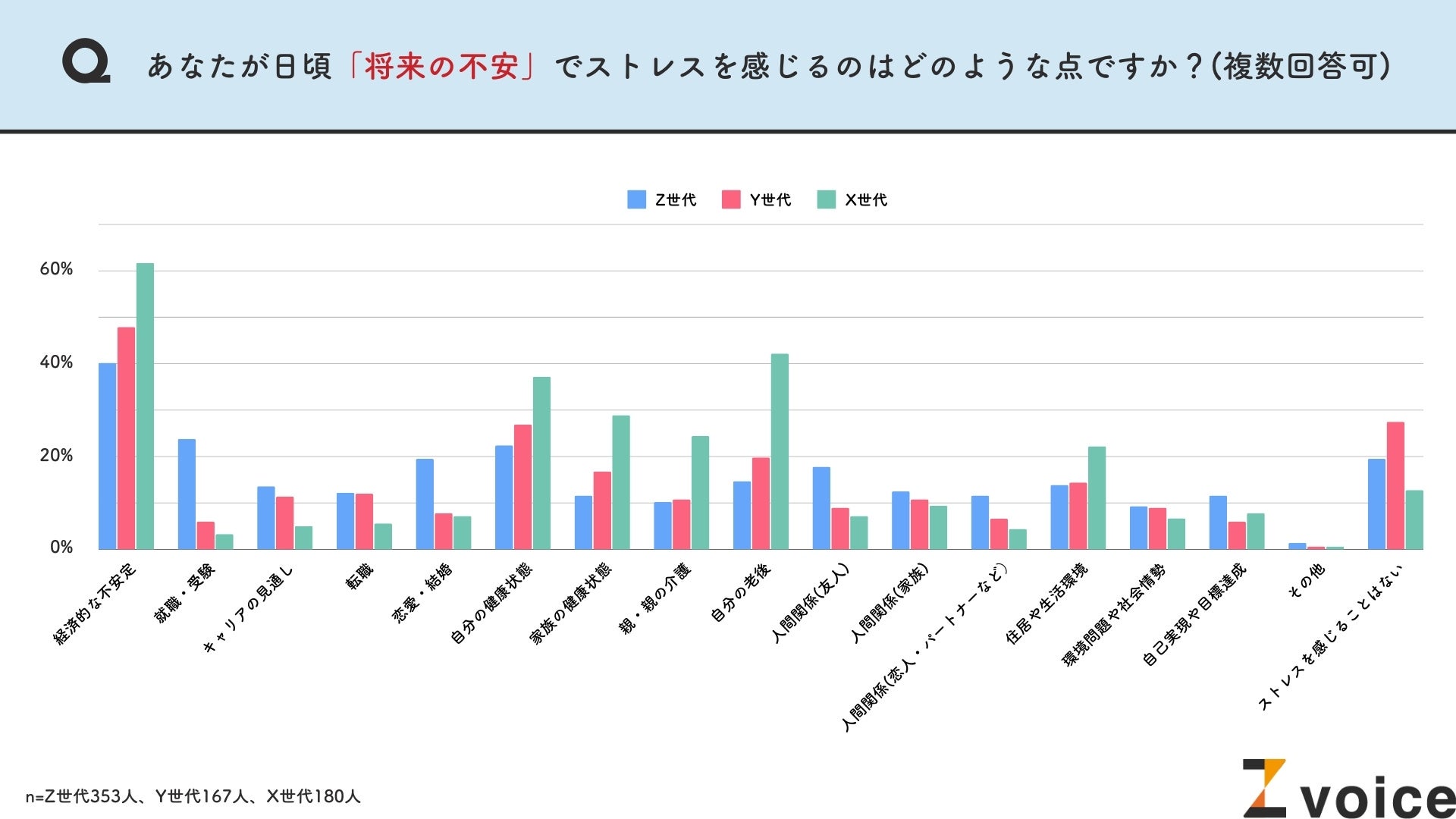 その結果、圧倒的に多かったのが「経済的な不安定」で、Z世代で40.2%、Y世代で47.9%、X世代で61.7%となりました。