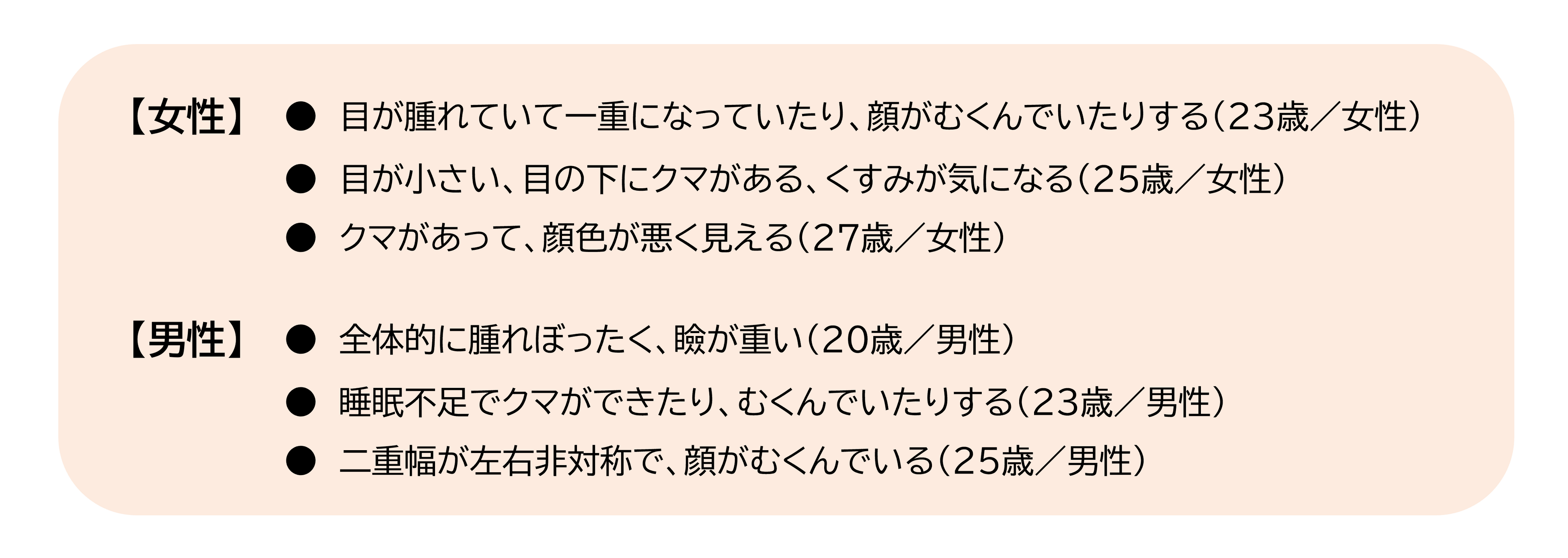 続いて、「今日イケてないと感じるパーツ」について聞いたところ、フェイスラインや頬、口もとに比べて、男女とも目もとが最も多いことがわかりました。目もとの具体的な状態については、目の下のクマ、目が小さく見える、目力がない、瞼のむくみなどが多く挙げられました。