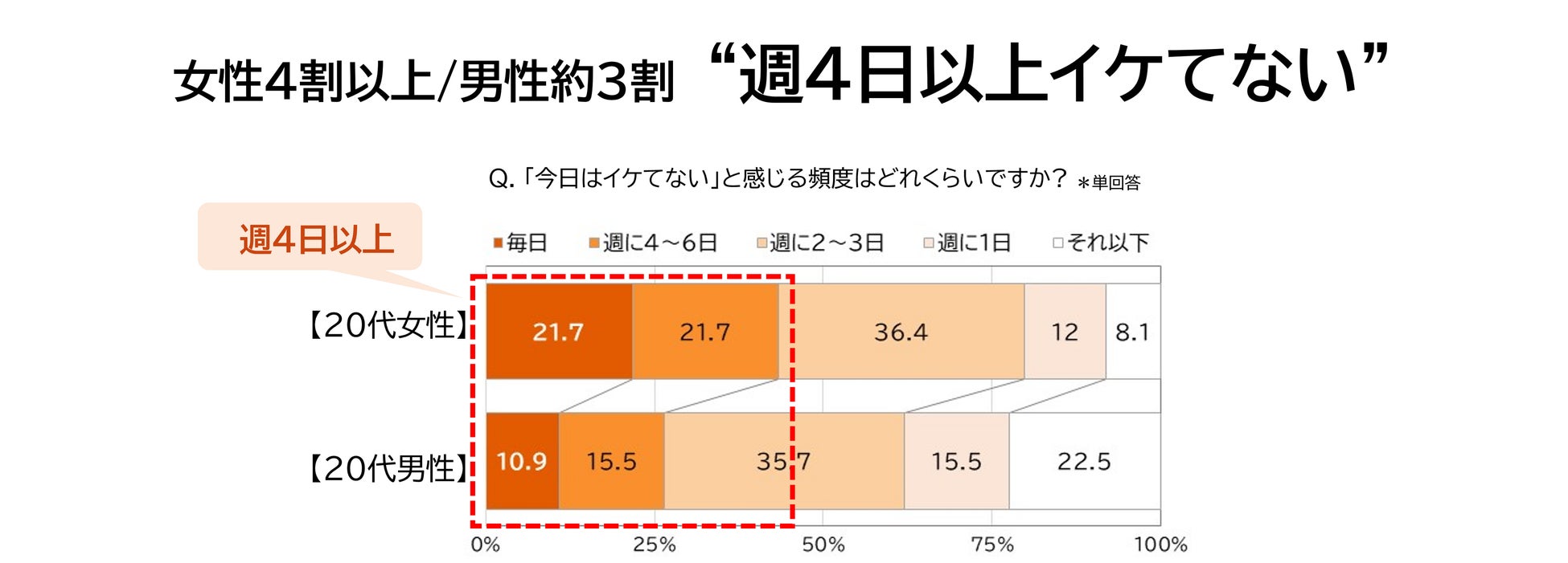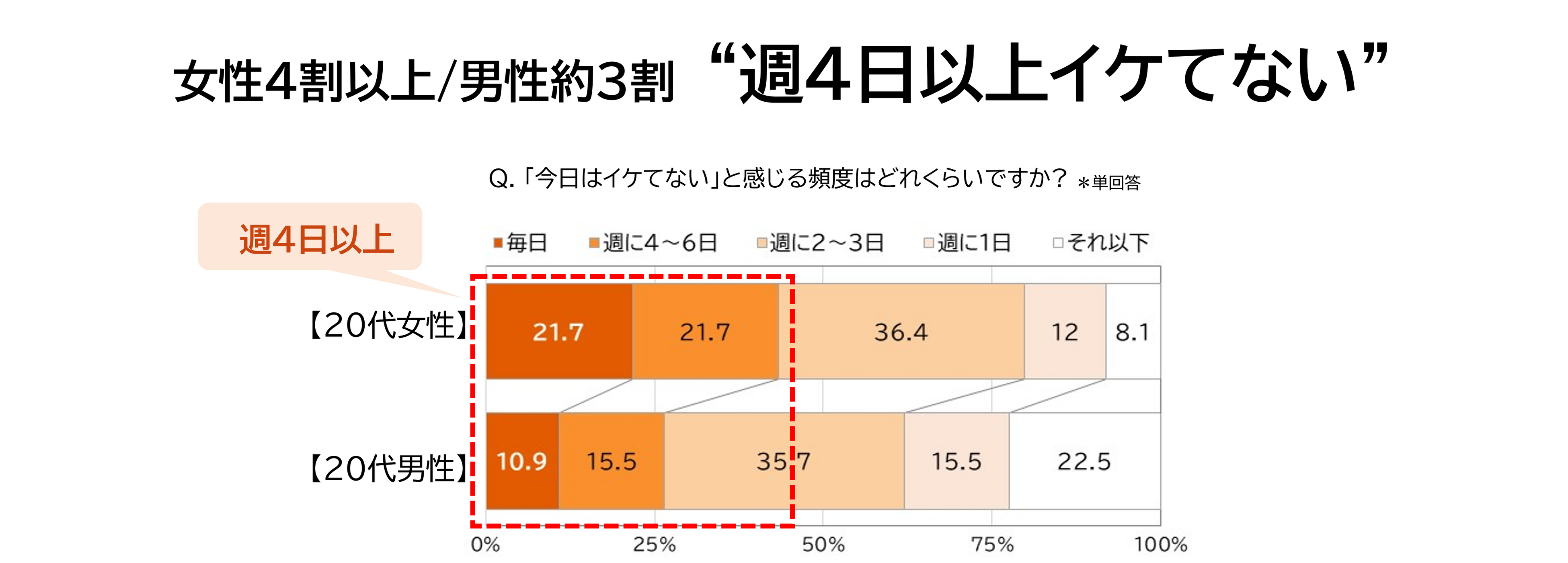 「今日イケてない」と感じる頻度について尋ねたところ、20代女性の4割以上、20代男性の約3割が週4回以上と回答。さらに、女性の約2割は「毎日」感じており、高頻度で日常的に顔の変化を感じていることが明らかになりました。