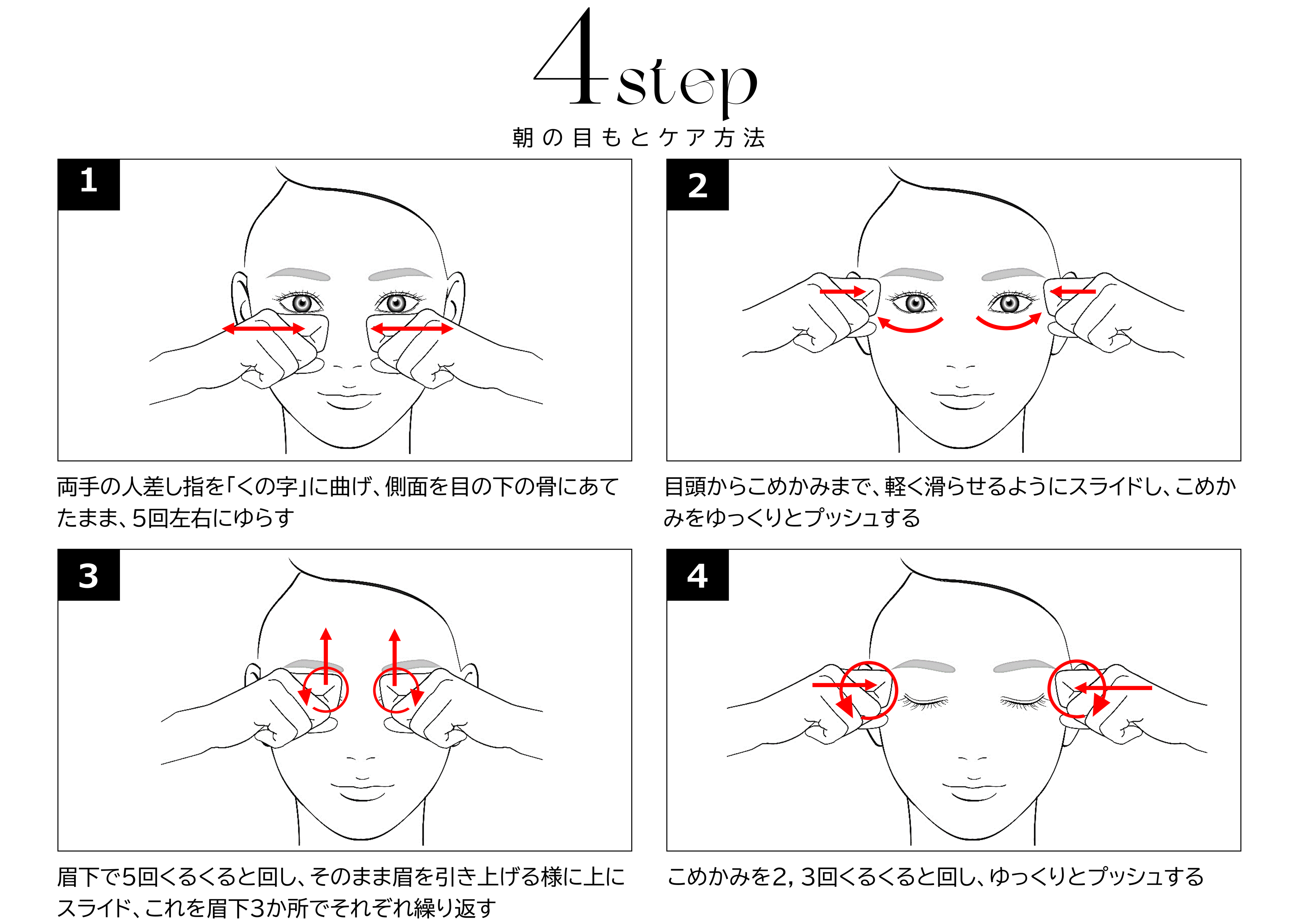 目もとのお手入れは、目もと専用の化粧品を瞼と目の下に塗り広げて、やさしく行いましょう。コンタクトレンズは外した状態でお手入れをしてください。