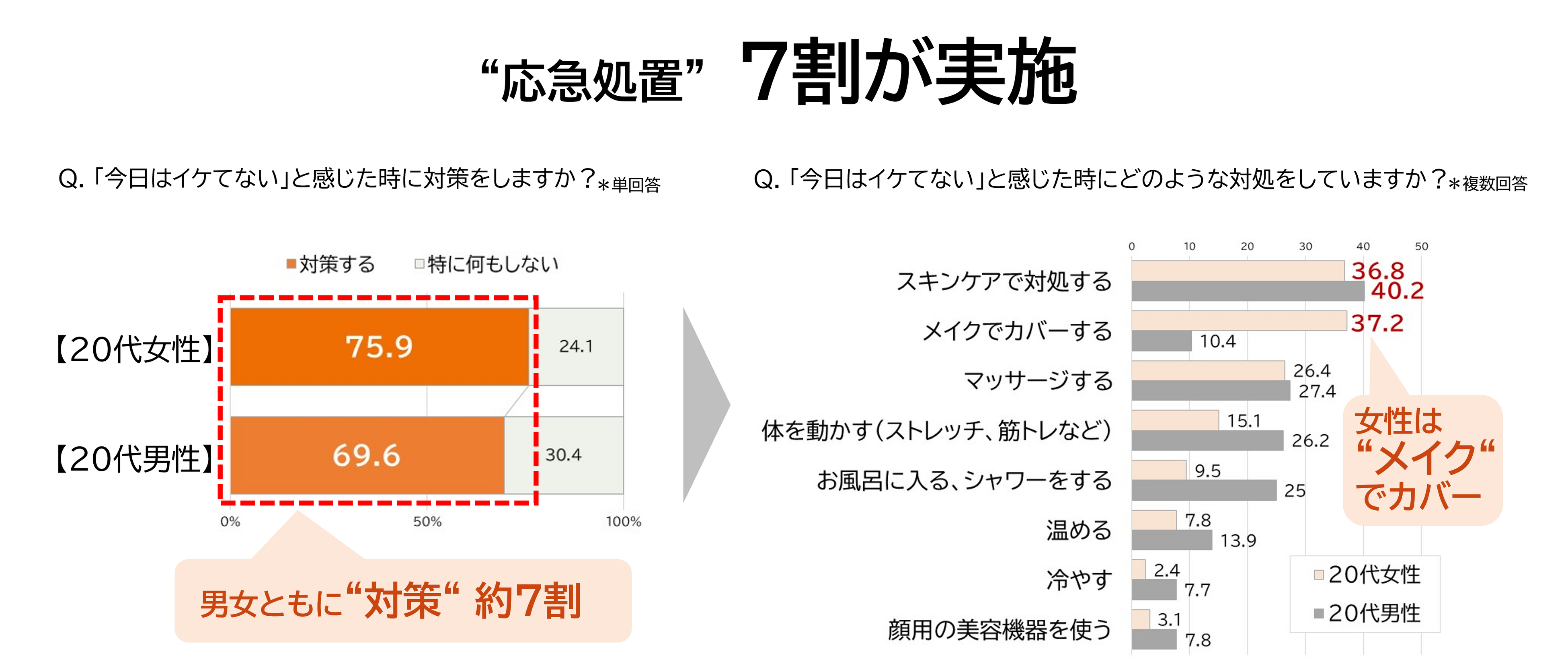 「今日イケてない」と感じたときの対処法について聞いたところ、20代の約7割が応急処置を実施していました。女性は「メイクでカバーする」が最多。これに対して男性は「スキンケア」が最も多く、さらに女性よりも「体を動かす」「お風呂/シャワー」「温める」などの対策が多い結果となりました。