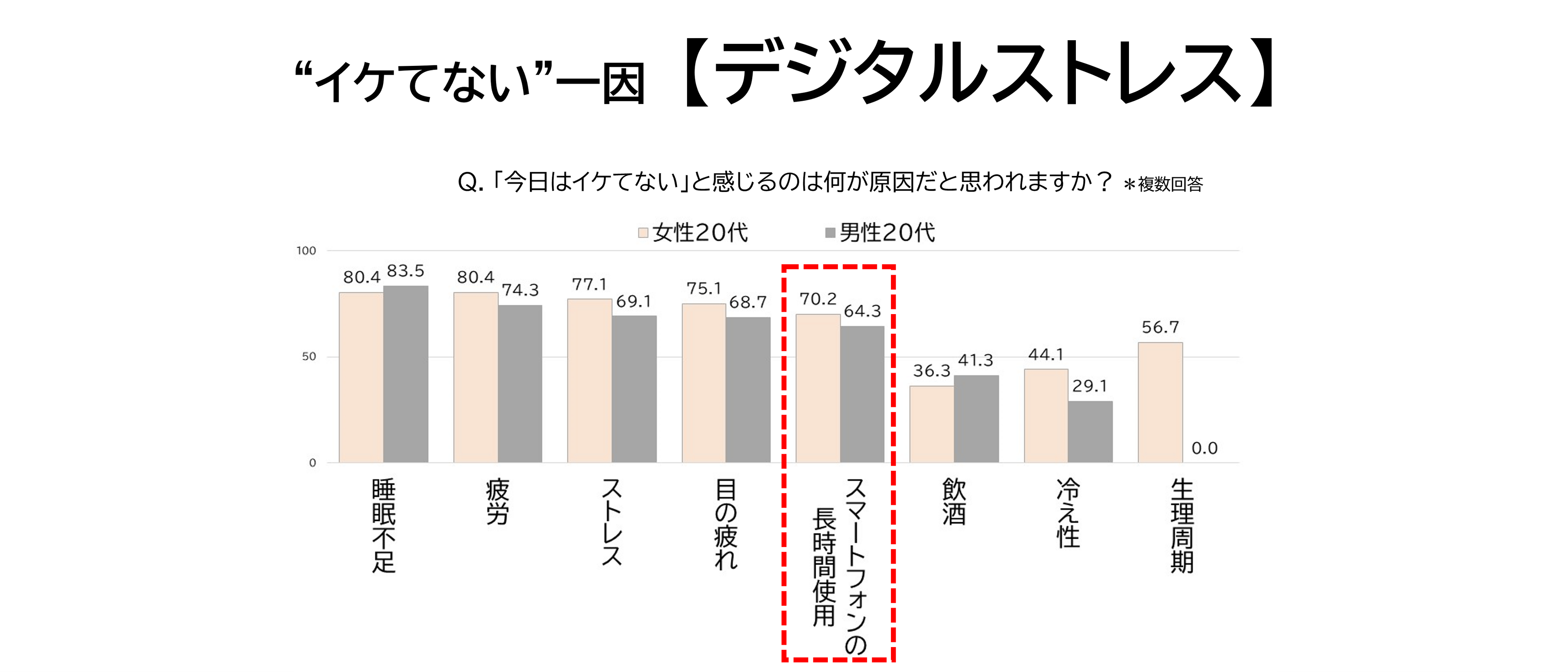 また、「“今日イケてない”と感じる原因」については、「睡眠不足」「疲労」や「ストレス」「目の疲れ」に次いで、「スマートフォンの長時間使用」も6割以上が選択。スマートフォンが手放せない現代人にとって、“デジタルストレス”は美容にも悪影響を及ぼしていそうです。