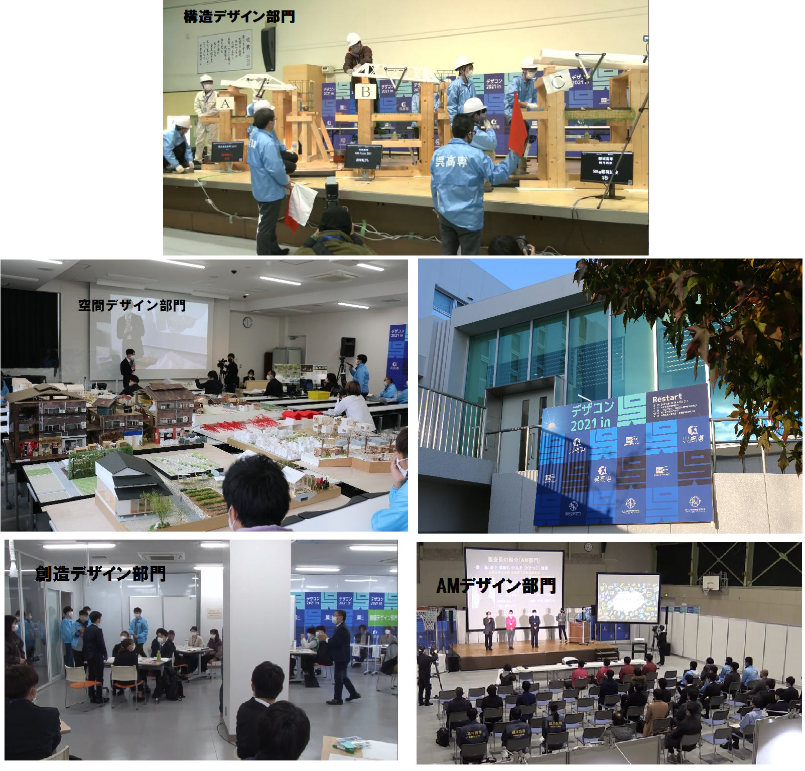 今回のデザコン・メインテーマは、長いトンネルの出口を目指し、再出発出来る日をイメージして“Restart”としました。人と人との接触が制限される現在においてRestartに向けてデザコンで何ができるか。例えば、「競技者が一つゴールに向かって共に競い合う一体感は共有したい」、「自らのデザインの原点を見つめ直したい」、「精神的な負荷や差別や偏見をデザインの力で少しでも減らしたい」、「持続可能なデザインの創出にチャレンジしたい」・・・など、困難をチャンスに変えるようなデザコンにしたいという思いが込められています。そんな思いのもと、全国及びモンゴルから多数の応募がありました。構造デザイン部門は35作品、空間デザイン部門は143作品のうち12作品、創造デザイン部門は33作品のうち9作品、AMデザイン部門は16作品のうち8作品が本選へエントリーしました。新型コロナウィルスの感染拡大防止のため、一般の方の来場は制限し、YouTube配信となりましたが、現地参加学生達の熱気に満ちあふれ盛況のうちに終了することができました。