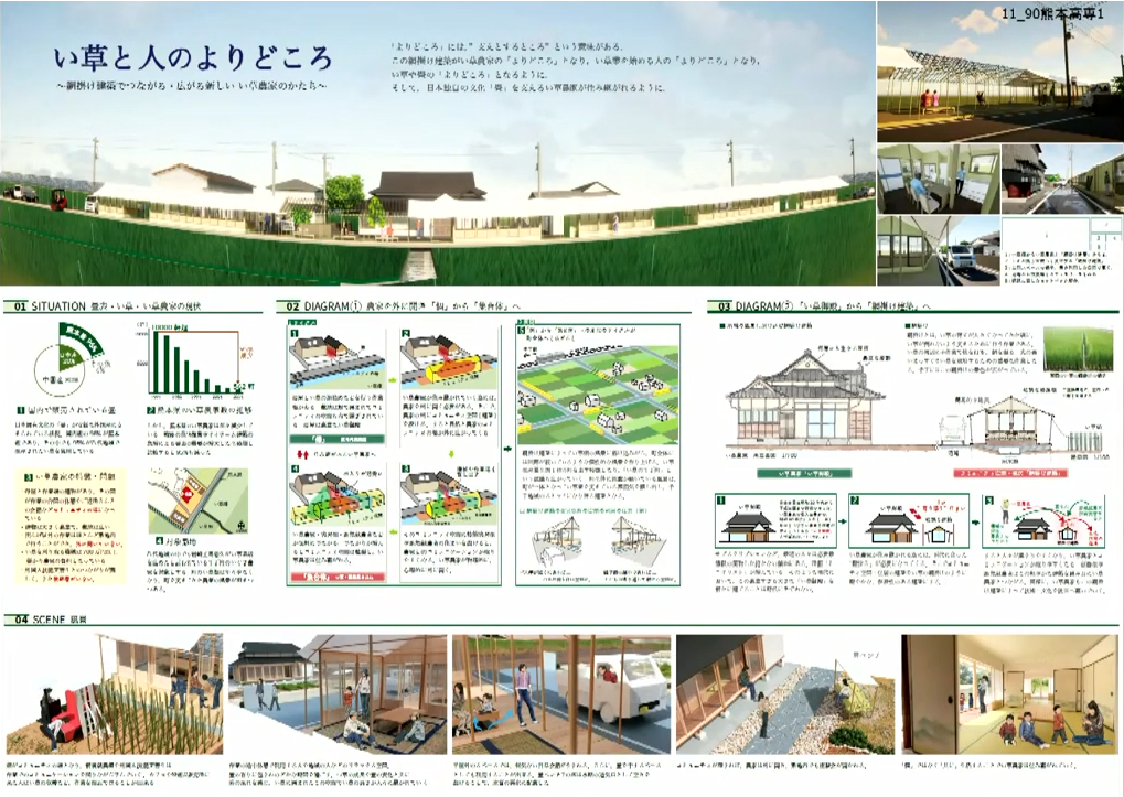 | 最優秀賞(日本建築家協会会長賞) | 『い草と人のよりどころ~網掛け建築でつながる・広がる新しいい草農家のかたち~』 | 熊本高等専門学校 八代キャンパス |
