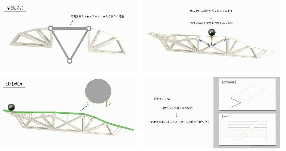 - 橋の中央は、圧縮材を取り除いたため鉄球軌道の途中に長い部材が出来るため、安定させるために圧縮材と梁材を用いた、張弦梁構造を使用し強度を高くした。