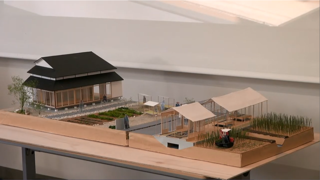 - い草農家と新規就農者、外国人技能実習生が共に農業に従事できる空間として網掛け建築を考案した。網掛け建築の構成内容は、住居スペース・共有スペース・休憩所・特産品販売所・カフェとすることとした。住居スペースは、新規就農者や外国人技能実習生のための住居。共有スペースでは学んだことを共有したり、食事をするスペース。休憩所では作業の合間の休憩所となり、作業のコツなどをい草農家から教わるなど教室的な役割を担う。