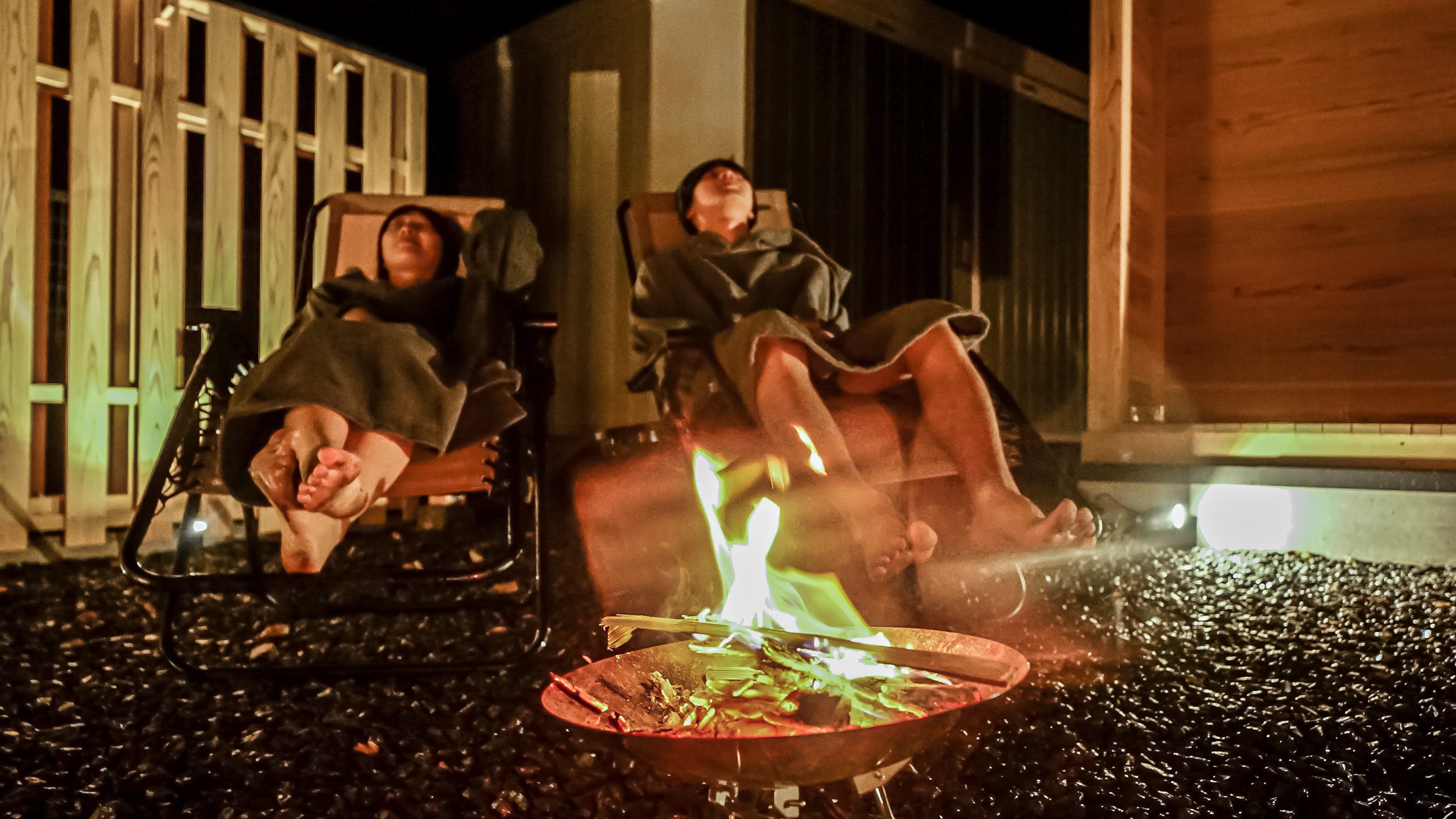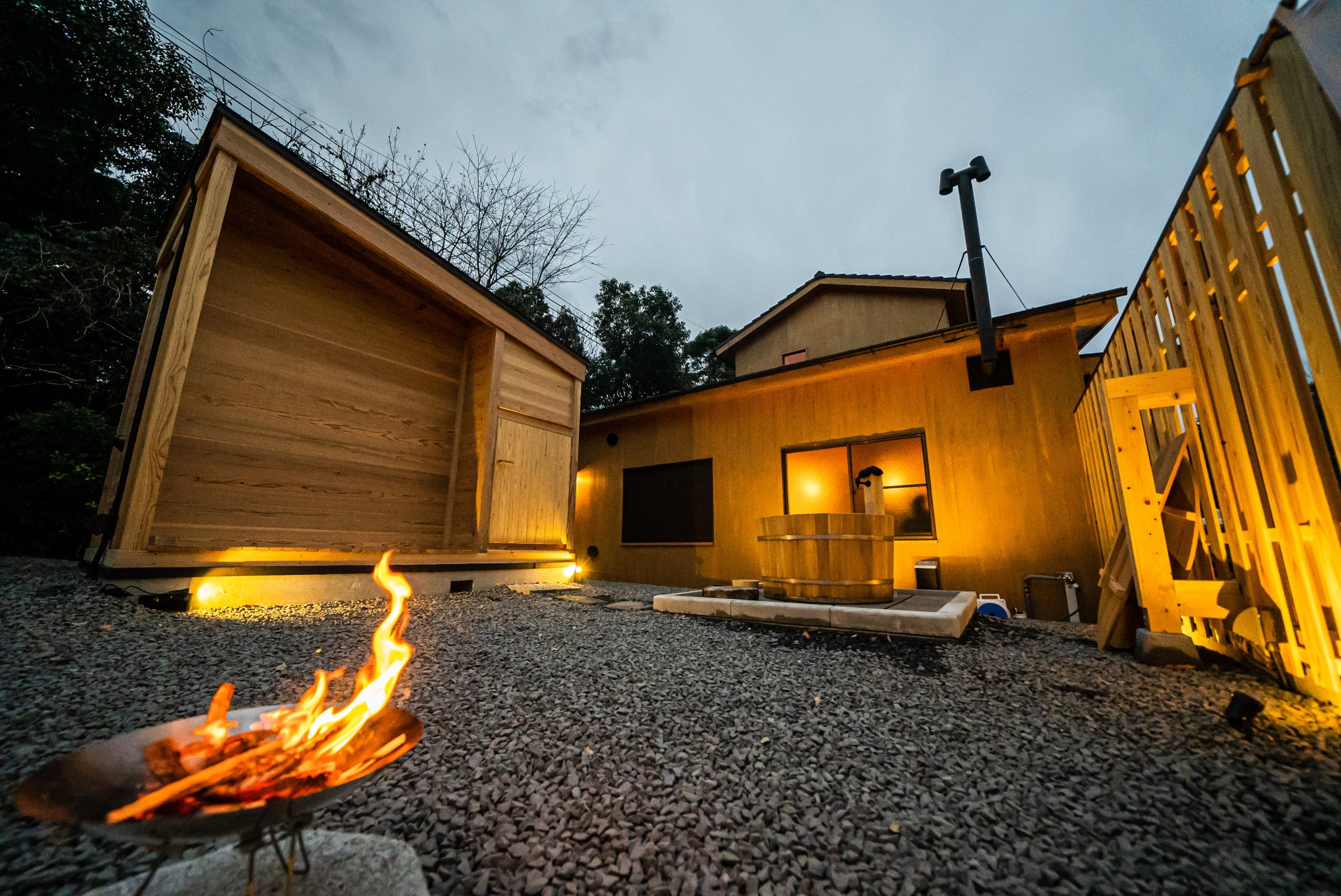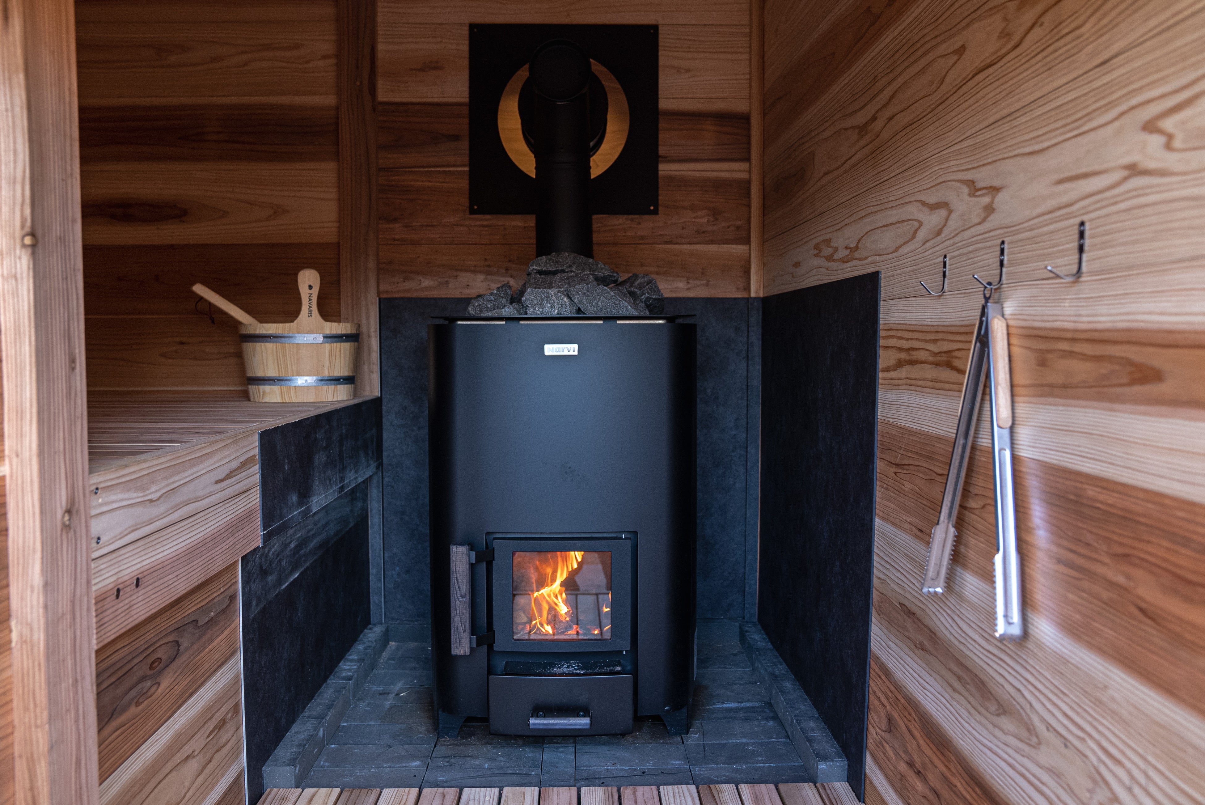 すでに温められている中に入る一般的なサウナと異なり、薪割りや火入れなど、お客様ご自身で一から作り上げるフィンランド式サウナです。1組限定の貸し切り宿なので、私語や寝転がることは禁止されておらず、自由に楽しむことができます。サウナのすぐ横に露天の水風呂があり、”サウナ⇋水風呂”のサイクルを何度でも堪能できます。水風呂の巨大な風呂桶は、和歌山県名匠にも表彰された、地元の桶職人・松本濱次さんが手がけました。