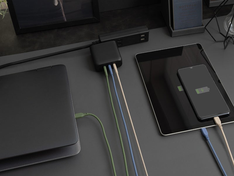 従来のシリコン充電器に代わり発熱性が少なく耐久性があり小型化できる次世代型素材といわれる窒化ガリウムを採用した本商品は、コンパクトなのにUSB Type-C ポートで最大PD100Wの急速充電が可能です。MacBookなどノートPCの充電だけでなく、家族でスマートフォンの充電もできます。