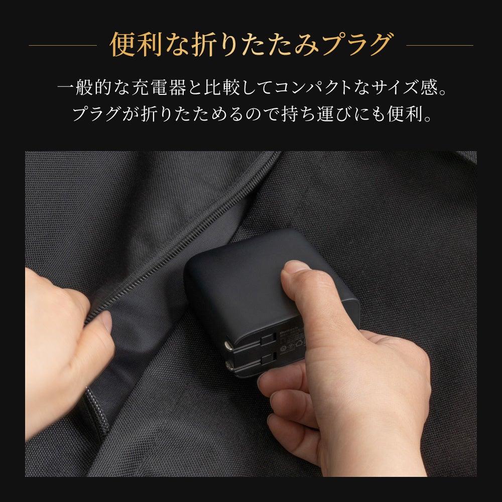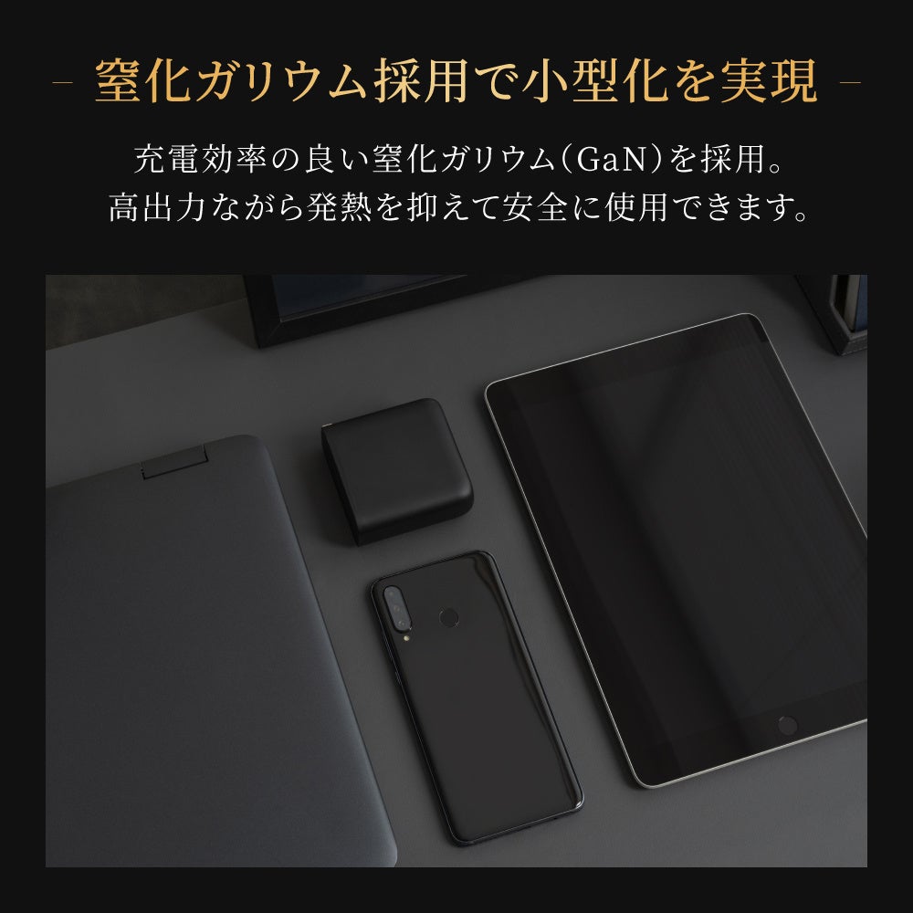 充電効率の良い窒化ガリウム(GaN)を採用し本体の小型化を実現し、高出力ながら発熱を抑えて安全に使用できるAC充電器です。USB Power Deliveryに対応し、スマートフォンやタブレット、ゲーム機器だけでなく給電力の大きなハイスペックノートパソコンの充電や時間がない時の急速充電にも対応します。