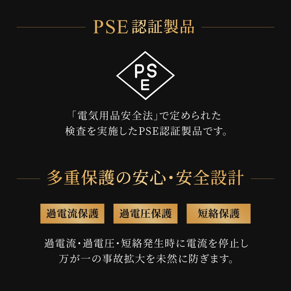 「過電流保護」「過電圧保護」「短絡(ショート)保護」の多重保護で高い安全性を備えており、万が一の事故拡大を未然に防ぐ安全設計です。