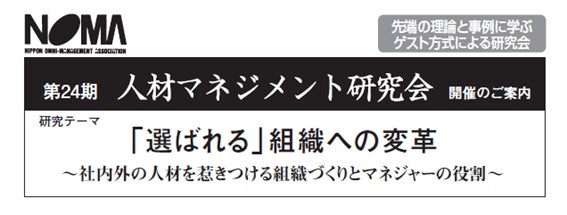 一般社団法人日本経営協会(本部事務局:東京都渋谷区 会長:高原 豪久)は、人事・人材開発部門を対象に、人事施策の実践事例を学ぶことを目的として開催する「人材マネジメント研究会」の第24期(2023年7月21日~11月17日:全5回開催)の募集を開始いたしました。 募集ページはコチラ https://noma-kansai.jp/pickup-seminar/post-3227/