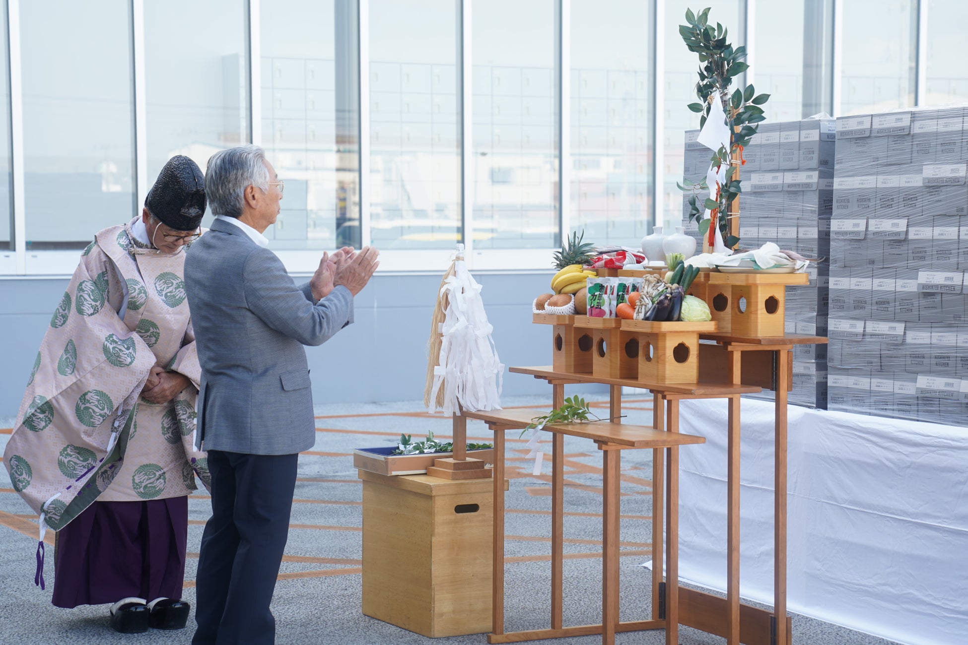 「良い年でありますように」と願いを込めて、毎年、地元・宮城県岩沼市にある神社の宮司様にご祈祷していただいています。縁起がいいとされる「大安」の日の午前中に、ニシキヤキッチンの本社近くの空港南工場敷地内でご祈祷していただきました。年始のご挨拶などに話題性抜群のカレーです。